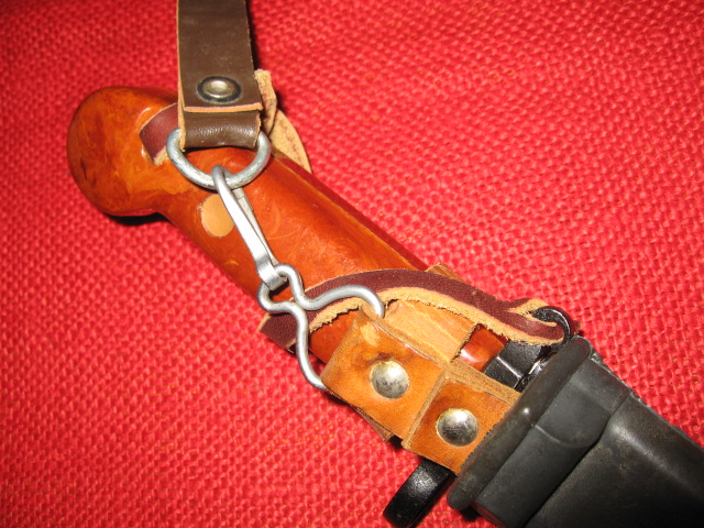 Ever since the Russians introduced the AKM 6X3 Type I bayonet and scabbard there has been a lot of speculation about the hole in the pommel and the hook on the crossguard. Was it to attach, hook or tie, a lanyard of some kind? Was it really designed for attachment of a short strap and why? The earliest illustrations I've found in Russian AKM manuals show a very rudimentary leather that looks like an after thought. The most common theory is that is was added to provide a more secure grip under adverse conditions. The smooth synthetic grip panels could be slick when wet or cold. The first strap appears to have been a simple leather strap with slots on both ends to form a loop at the pommel and hook on the crossguard hook. Below are a copy of a bayonet illustrated in an early AKM manual. The next pictures is of a replica I made from an original one. It was on an early 6X3 type I, but it was stiff, dried up and disintegrating. Since then I have found several other partial and damaged ones in shipping containers of reworked bayonets from Russia and Bulgaria. I have also had a Romanian 6X3 with a complete but hardened similar strap in place. Mike