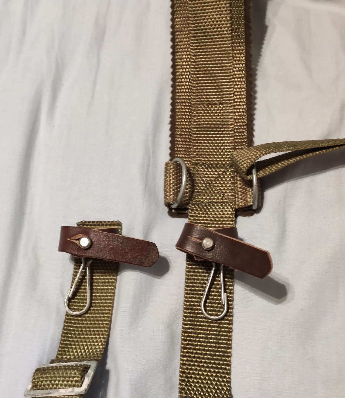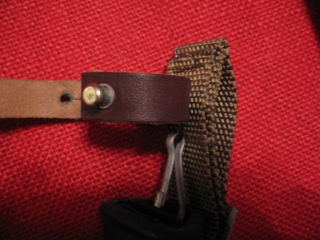 As a side note, I spent a long time with the one I received trying to make it fit. I took it all apart and tried to make it attach to the bayonet and scabbard. Not really very logical or functional. Talked to a friend in Poland and he said he knew that some guys where making them out of basically worthless surplus new Y straps. Not official, just for fun and make a little money!? More pictures and info under "Poland" heading. Mike
