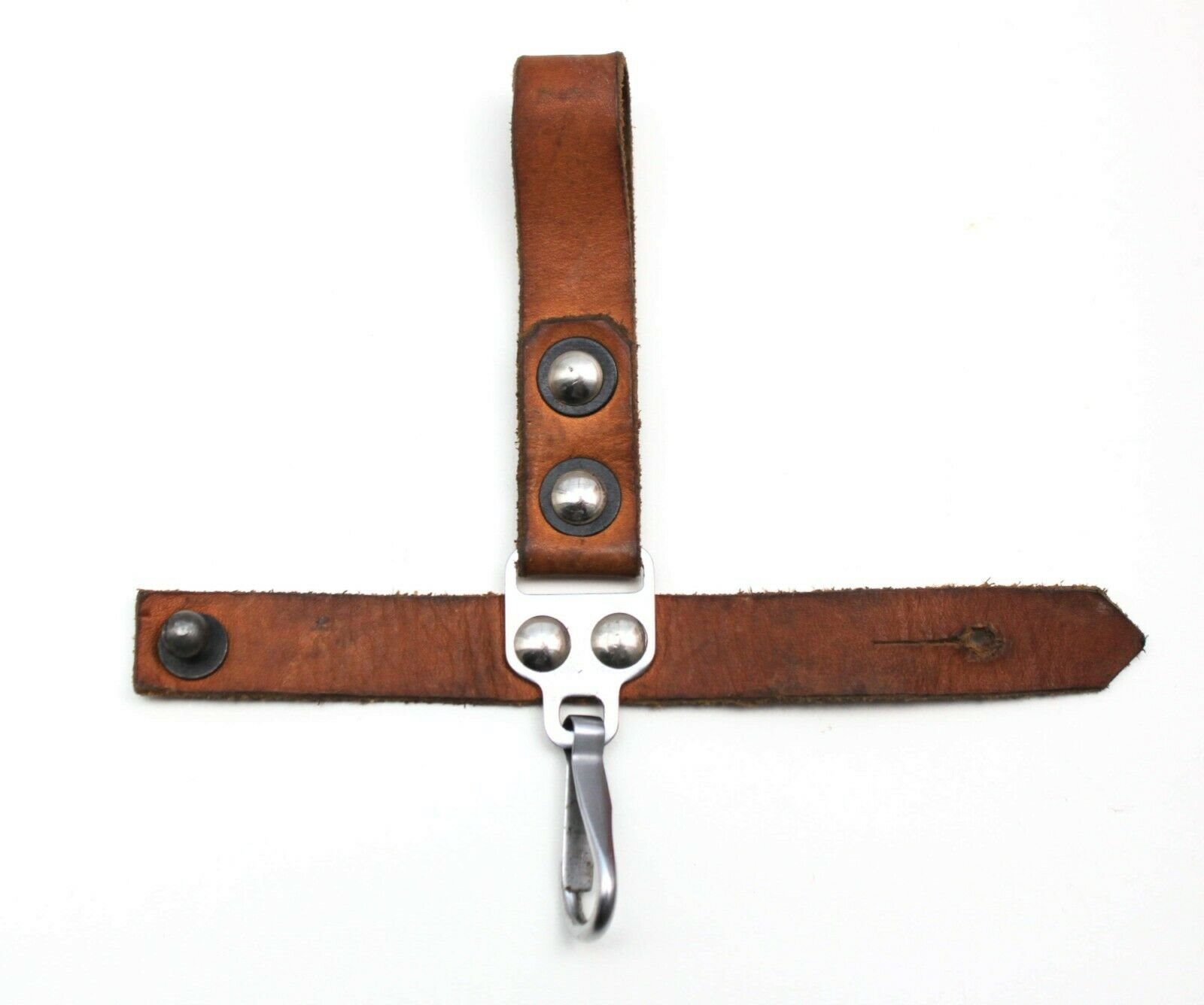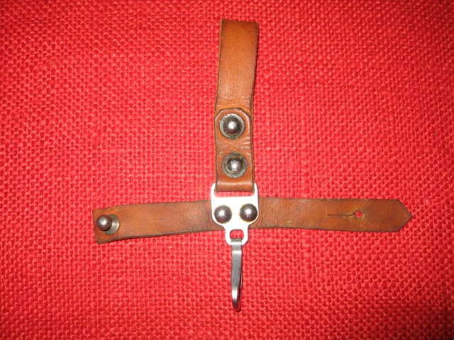 Here are pictures of the snap hook assemblies used of your ersatz Yugo hanger. These hooks were mass-produced by various US and foreign companies with minor variations. They were used on all sorts of military field gear from the 1950s -1970s. They are readily available even today in sizes from 3/4" to 2". The one pictured below is what I call a pack strap. It's a 2" wide carry strap that narrows down to a 1" snap hook. Available in bulk from many surplus stores.