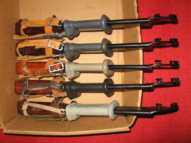 These are the five Tula 6X3 bayonets and scabbards I will display in my collection as of now. I believe they are a decent representation of the Tula production and issue during that time period. They are not original, they have all been issued and used. They have all been reworked at least once. Some 3-4+ times from the layers of crude touch up paint and crossed of nmbers. I have tried to return them to as near original as possible. They have no matching numbers, but they could easily be added with an electric pen just like they were after the last rework. I prefer not to. Mike