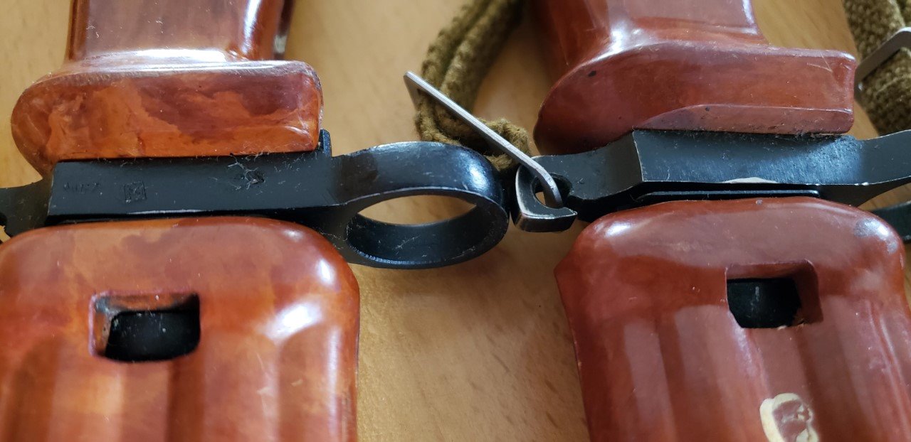 Has anyone else noticed the difference in the molding of Russian AKM 6X4 Type I bayonets from the Tula Arsenal? The Type I bayonets are the ones with the machined cross guards with flush ground rivets. I have both the early style with the arsenal mark on the flat behind the muzzle ring and the late style with the only arsenal mark stamped on the front of the cross guard by the blade. Both of these have molded grips with a flat front where they meet the cross guard. Both of the grips are smooth with out any mold marks. The grips on all the other AKM 6X4 bayonets in my collection from both arsenals taper to meet the cross guard.