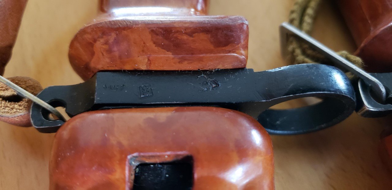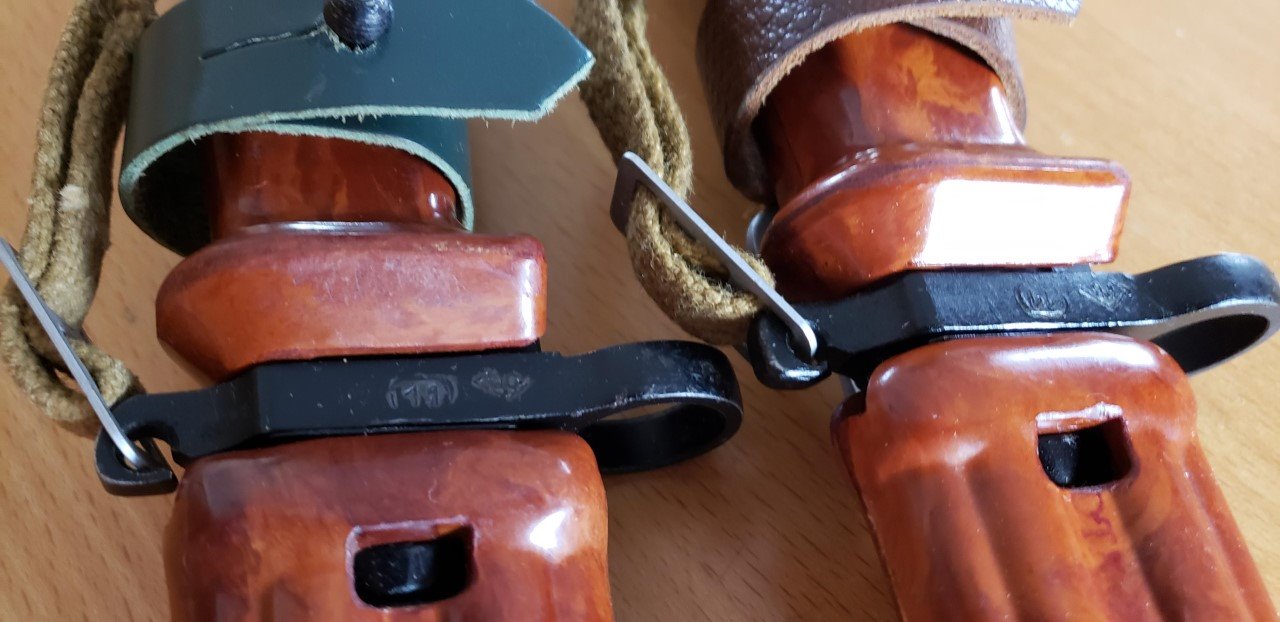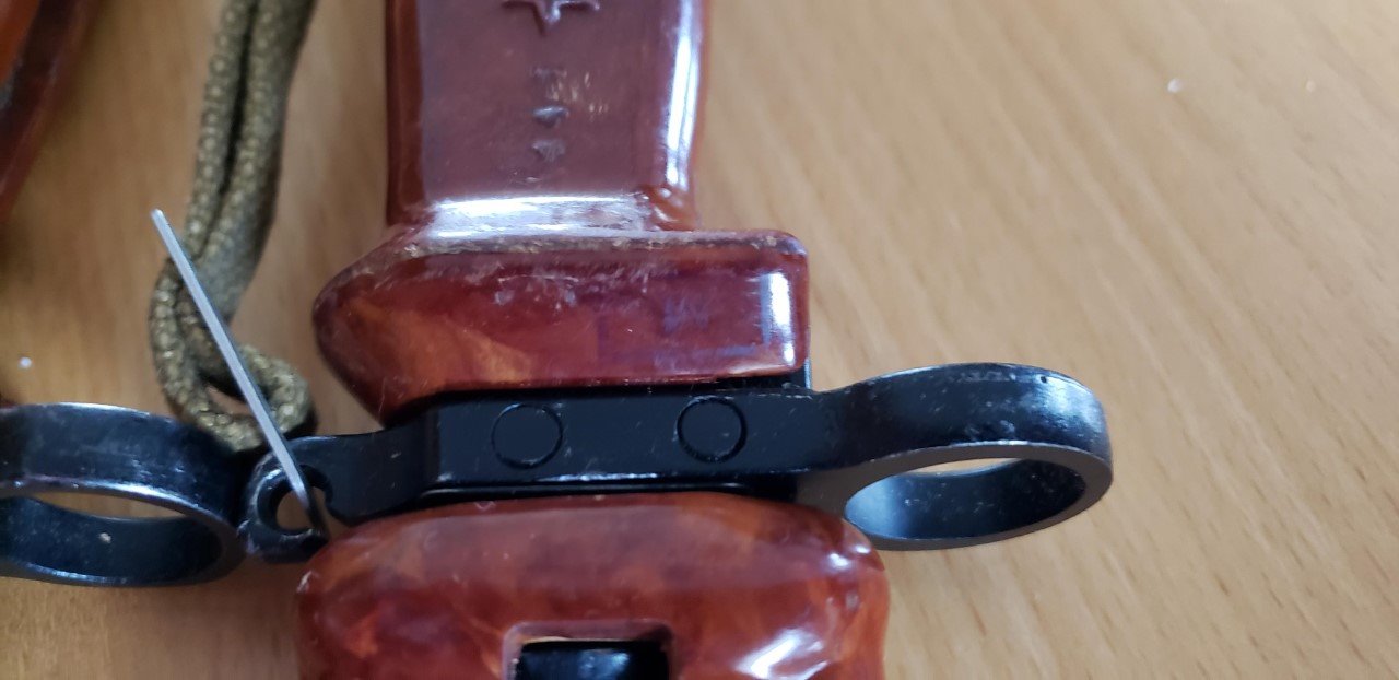 Has anyone else noticed the difference in the molding of Russian AKM 6X4 Type I bayonets from the Tula Arsenal? The Type I bayonets are the ones with the machined cross guards with flush ground rivets. I have both the early style with the arsenal mark on the flat behind the muzzle ring and the late style with the only arsenal mark stamped on the front of the cross guard by the blade. Both of these have molded grips with a flat front where they meet the cross guard. Both of the grips are smooth with out any mold marks. The grips on all the other AKM 6X4 bayonets in my collection from both arsenals taper to meet the cross guard.