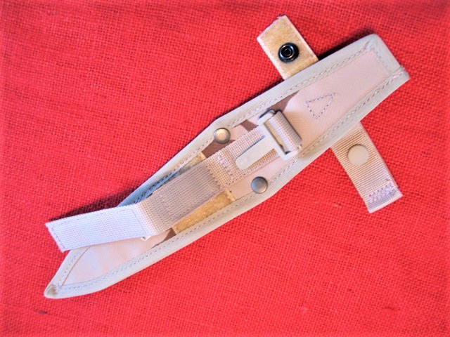 I recently found a picture online that shows some additional variations of this style of Czech VZ58 scabbards. The different "woodland" pattern, second from right, has camouflaged edging and hilt strap were as the first pattern, second from left, had plain color. The scabbard on the far left appears to be designed to hang vertically point up? Mike