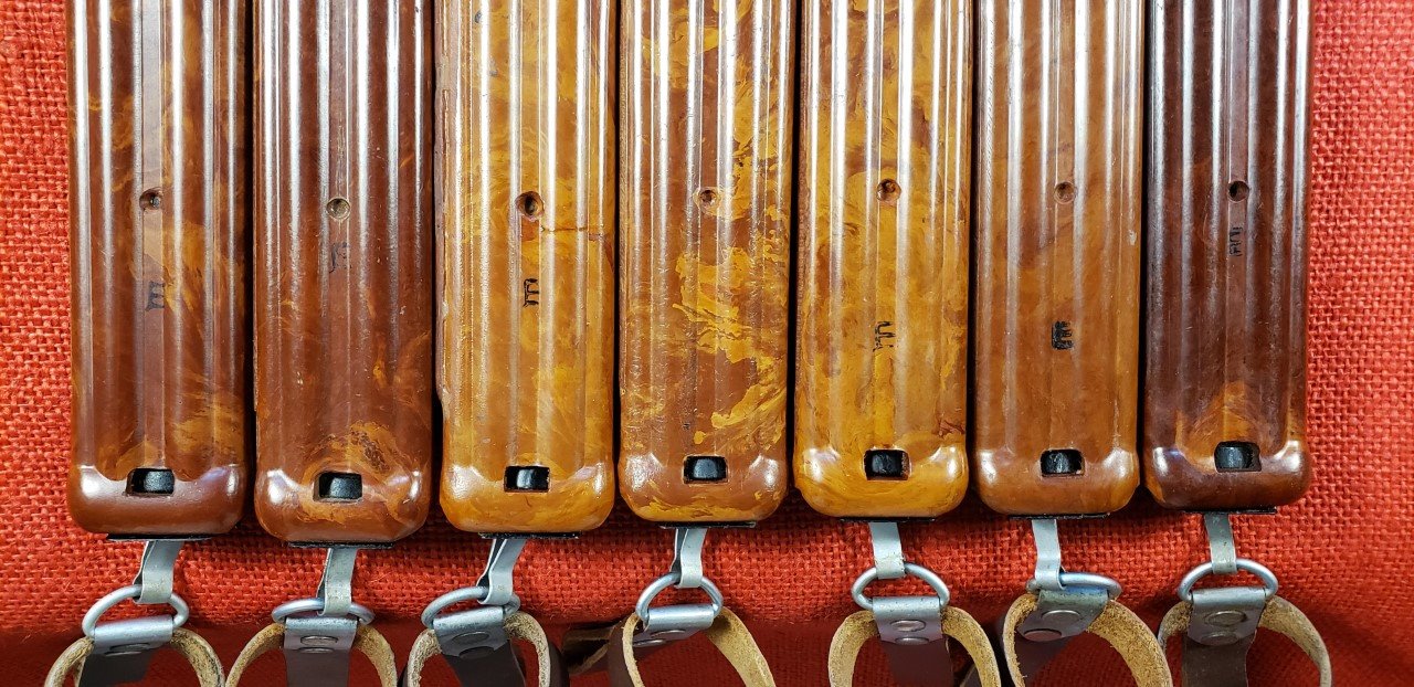 All the AKM Type II scabbards also have black ink marking that seem to wear away easily. There is a large Cyrillic De (looks like "A"?) on the lower front of the scabbard body. I believe this is the final inspection mark of the scabbard molding process. This mark is in the same area as the scabbard numbers and may be partially wiped away during numbering. The scabbards also have a black "E" on the upper front indicating that it passed the electrical resistance test. Mike