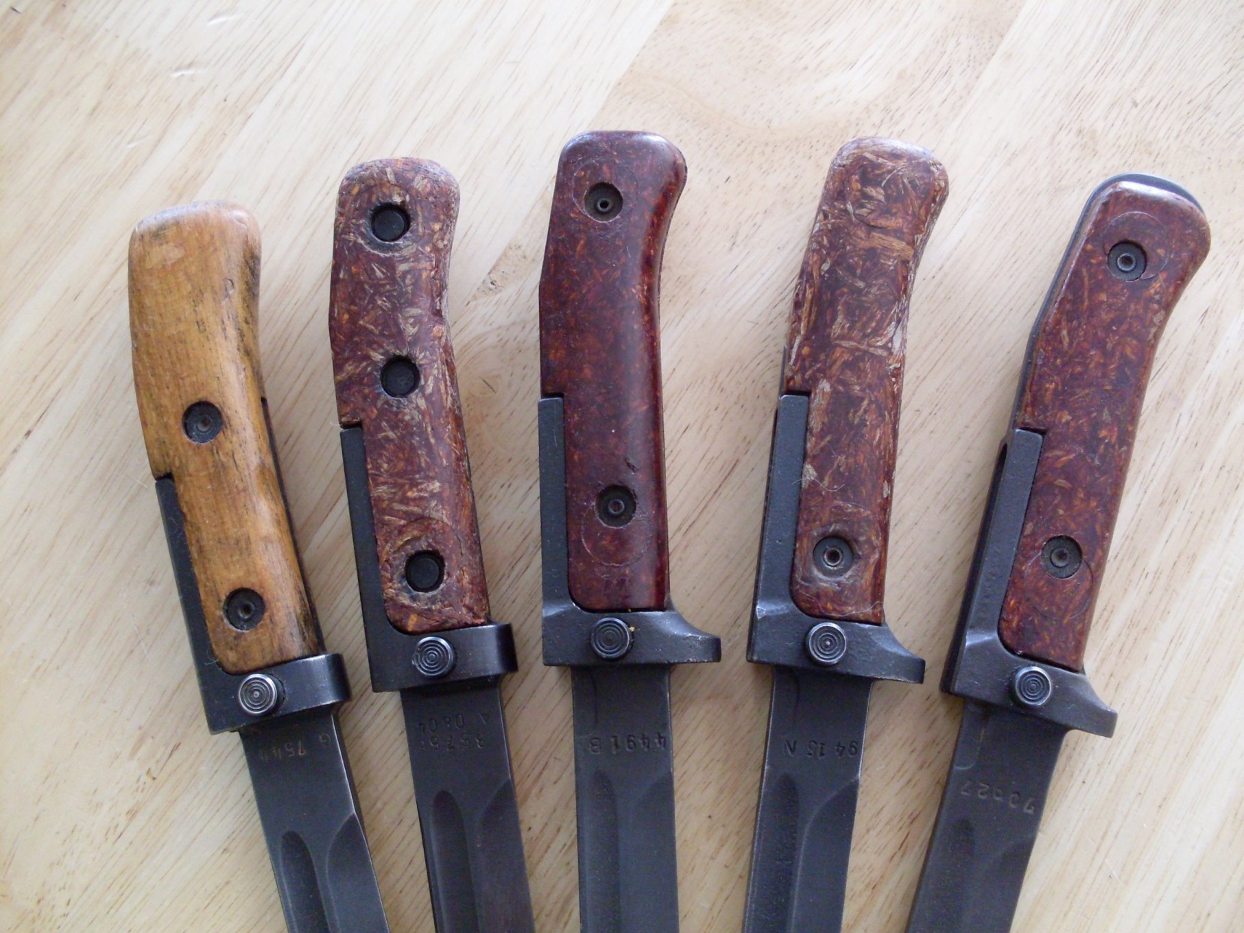 The second picture is a nice group of Type I bayonets with a variety of wood chip grip panels. One appears to be original due to 2 rivets and placement. The others have been repaired or reworked with non-original glue only and /or rivet placement. Most of the bayonets that the Czechs released as surplus are ones that have been inspected, repaired and reworked and placed in reserve years ago. Grip repairs and replacement were only done to be functional with no standardization. Mike