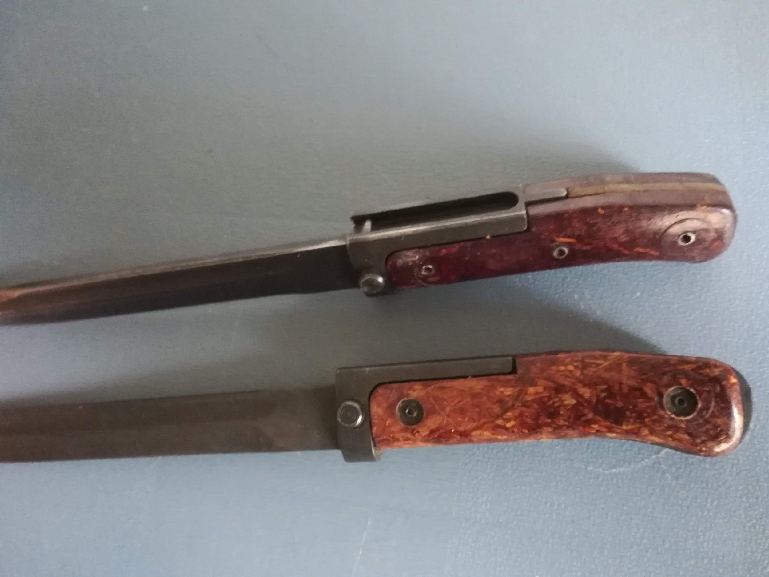 The third picture is very interesting. The top one is a type is a Type I bayonet that has been repaired using flat Type III grip panels and a piece of wood(?) filler where the Type III tang would be in the hilt. All this secured using 3 rivets. The 3 types of VZ58 bayonets only used 2 rivets in standardized placement when new from the producing arsenal / factory.
