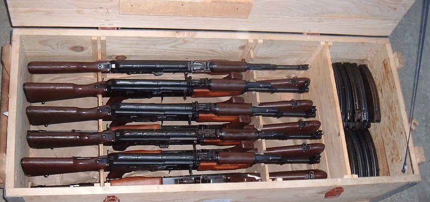 I recently found this picture and thought I would share it. It shows how AKM rifles are packed for shipping/storage. From the factory they would probably be consecutive numbered with matching numbered bayonets and scabbards. Ten rifles with slings on the lower level, Bayonets with scabbards, hangers and straps on top. A packing/inventory list in the middle. Magazines and other accessories on the left side.