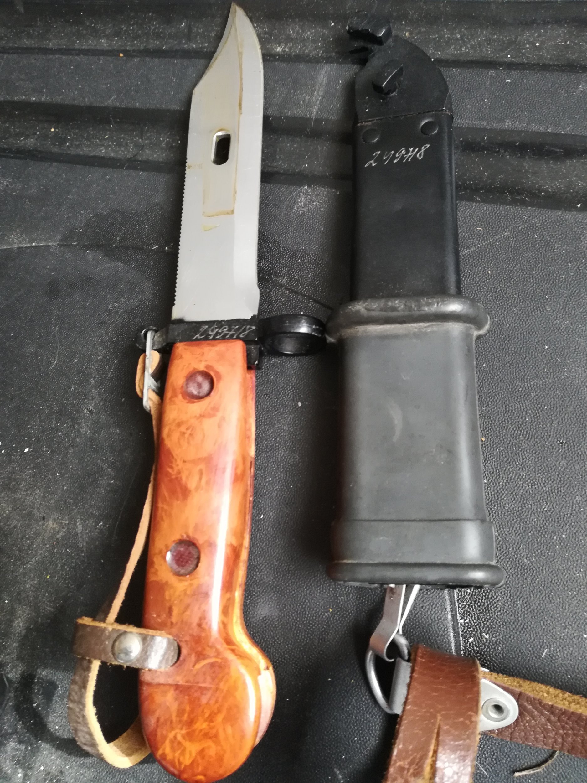 The bayonet and scabbard you pictured have been completely reworked / refurbished. It appears the grip panels, insulator, hanger and strap have all been replaces with new parts. The bayonet and scabbard have been repainted. Original numbers have been removed and/or painted over. New forced matching hand etched numbers have been added.