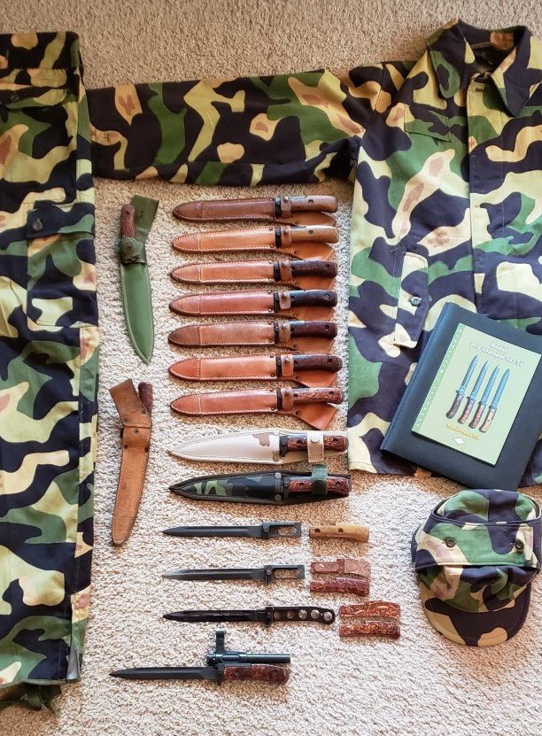 Below is a picture of just my Czechoslovakian VZ58 bayonet collection. The Czech VZ58 rifle has nothing in common with AK rifle series except for the ammunition, 7.62x.39mm. Nothing else is similar or interchanges. The Czech bayonets also have nothing in common the AK bayonets. Yet because the VZ58 and AK rifles look similar, we include them in our collections. They are not wire cutters. They are not numbered to a scabbard. They have one piece scabbards and hangers that are all leather or fabric. They also have a different method of mounting on a rifle. The items pictured below represent the three original authorized variations in the bayonets and scabbards plus the only authorized modifications. The book is a Czech language reference with a note book of translations from this book and other related references. I used the uniform as a prop. It is an original 1960s Czech 3 piece, (pants, jacket, hat), field uniform, dated 1961. It is in new, never worn, condition and has been in my collection for about 50 years. It's all cotton and heavy duty, weighs 4.2 pound. It is for sale or trade if anyone is interested. More pictures, information available on request.