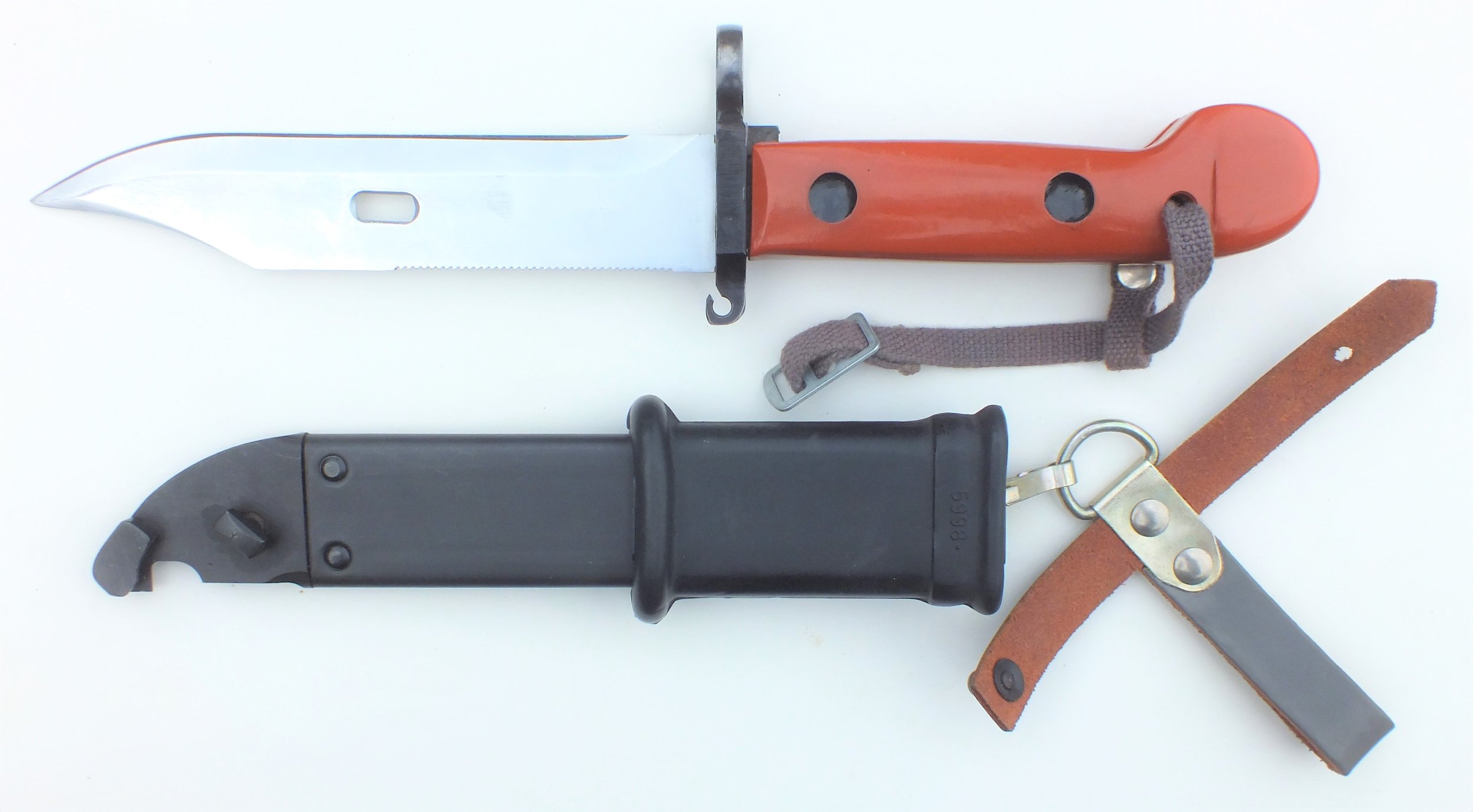 Hi Alexander, You are correct, as far as you go. The top one is an East German, (DDR-NVA), AKM 6X3 Type I bayonet and scabbard with all the correct accessories. Also known as the M.59 version in Germany. The lower one is a Polish AKM 6H3 Type I bayonet and scabbard also with all the correct accessories. Both of these items are in separate private collections. The pictures provided by the owners. They are rare, but the existence of both is documented. Both are very unique! What is special about them? How to identify them?