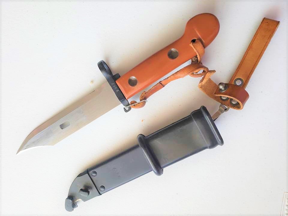 The DDR had been licensed to make the AKM 6X3 Type I since 1959 (M.59). Poland received a license in 1966. In 1967 the innovation program also encouraged cooperation between member countries. To satisfy the officials and politicians, it was agreed to have the DDR work with Poland as they were starting up. A team from both countries was challenged to find a way to simplify, economize and improve the production of grip panels on the AKM Type I bayonets. The militaries from each country were to provide 10 complete new bayonets and scabbards to use as samples. They were removed from inventory and written off. The innovation team was also provided with the orange thermoplastic material. They made molds and simply poured the melted plastic into the molds. Done by hand, no machines, no pressure injection. The original grip panels were removed from the new bayonets and replaced with the new orange panels. No new numbers or marking of any kind. The only exception was the Polish oval 11 for ID, even though they were not arsenal produced.