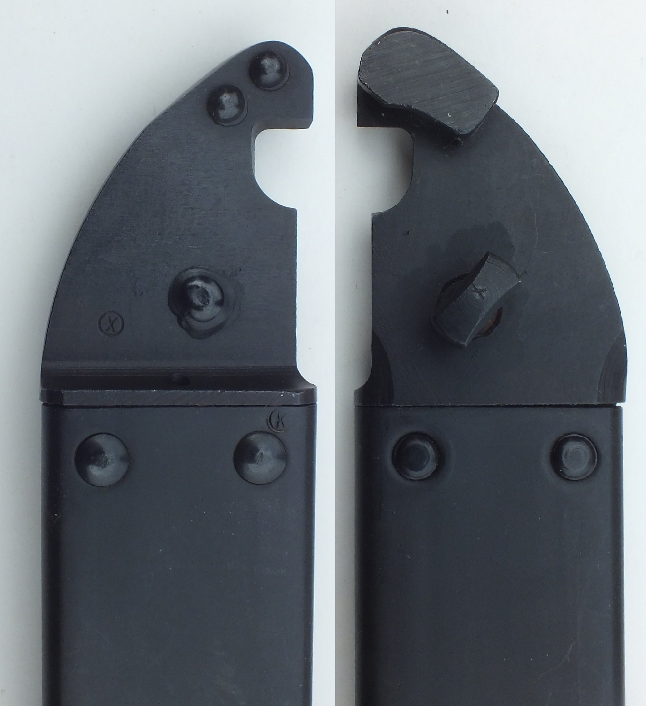 The Polish however I have only heard little about and I would be interested in hearing more about it. To me it appears to be out of a very small production run and if im correct its also marked with “11” on the grip. The same markings are found on the backside of Polish prototype 6x4 plastic scabbards, in the place where we have our usual “arrow in triangle”.