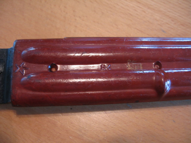 Here are pictures of repainted Russian Tula Transitional(?) bayonet and scabbard. Actually this is a reworked mismatched early 6X3 bayonet (circle pattern catch button), with a later 6X4 scabbard with forced matching numbers and replacement rework style strap and hanger. The paint brush marks and runs are apparent in the medium red finish. Brush marks are also noticeable on the scabbard which seems to be more of a yellow finish. Note the white Tula proof marks that are now a yellow/orange. M.