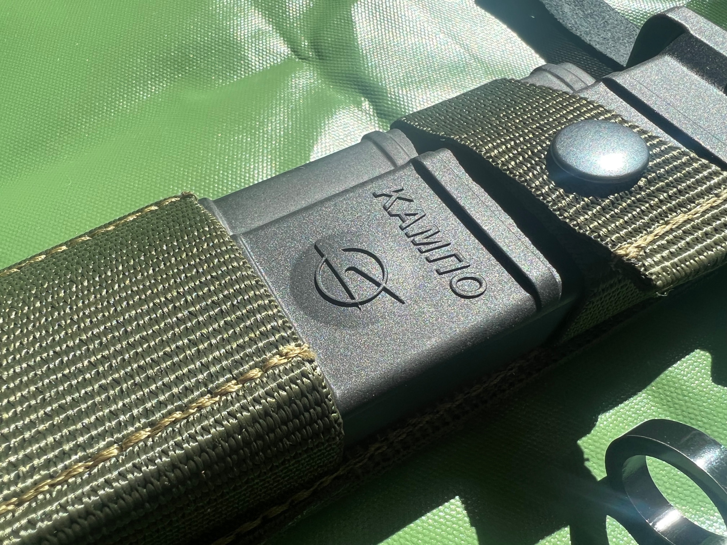 There has been made quite a few changes in the design comparing to the later second model. Note the changes in blade design and finish. The scabbard of the trail version is heavier with a thicker sharpening stone and more screws overall. Cutter plate area on the trail version is of a different type finish in the metal surface. Grip and pommel is near identical. The colour of the frog fabric is also different between the two with a lighter green on the prototype.