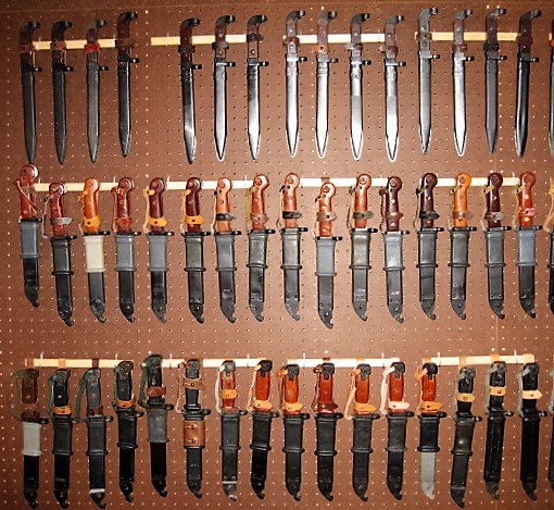 How do you display or store your items? This is how I display my main collection. These three pictures are of one wall displaying what I consider major variations of AK47, AKM and AK74 bayonets. They are easy to locate and remove for study if needed. There is a second wall with a further 100+ AK related bayonets including spikes, non-traditional and minor variations. Spares and accessories such as hangers, wrist straps, insulators, etc., are kept in drawers.