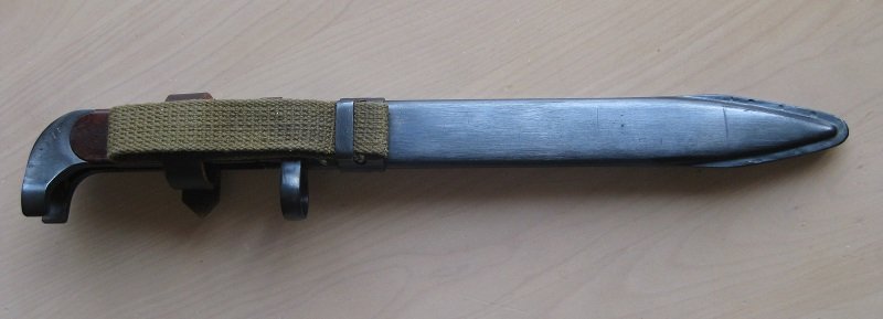 You need to confirm a few things not shown in the pictures to make the identification positive. The scabbard should NOT have a drain hole and the leather hilt strap should be sewn to the fabric hanger. The right side of the bayonet pommel should NOT have a CB in diamond stamp which would indicate Russian military acceptance.