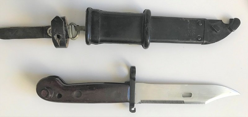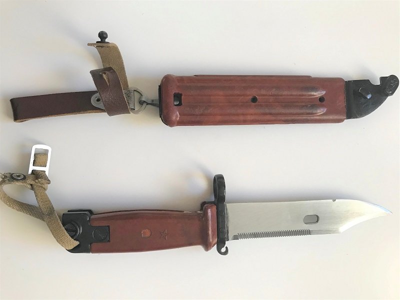 I am not sure where to start on this picture. I agree, not a very good picture, fuzzy focus and only of one side of the bayonet and scabbard. I will try to tell you what I can observe and my opinions. Let’s start with the hanger. Brown pebbled leather and a flat “D” ring. Definitely Russian. These are usually issued with a AKM 6X3 Type I or early 6X4 Type II from Izhevsk. However, hangers can be exchanged or replaced at any time. The strap appears to be Russian due to the color, fabric weave and rivet.