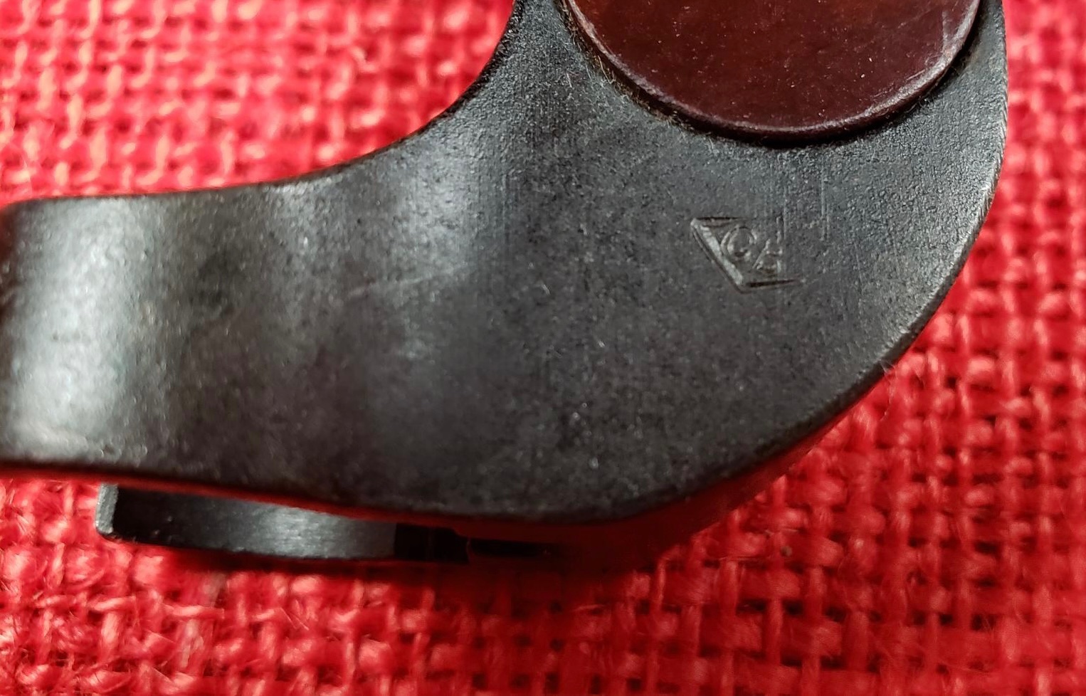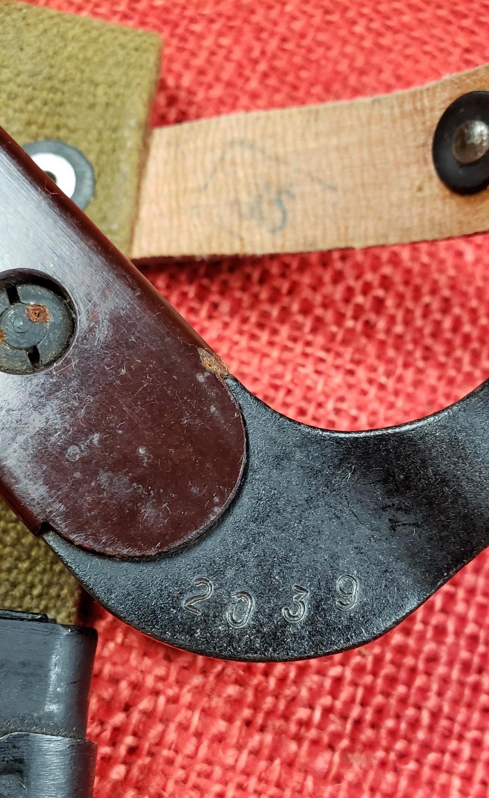Let’s start with the scabbard. It is the early style with the two band hanger brackets. It has no visible drain hole at the tip. The Finnish scabbards do not have holes. Some early Russian scabbards did not have drain holes, but most were added during ongoing inspection, repair and rework over the years. The Finnish 1st contract (early) scabbards had two tone sanded body that was then blued. The appearance was similar to the Bulgarian scabbards. The Russian scabbards had no sanding and were painted black. Both the early Finnish and Russian scabbards had a tan/khaki woven fabric belt loop. They also both had a leather hilt loop. All the Finnish ones had the loops connected bay sewing. Some Russians were also sewn, but most were connected with a single rivet. The Finnish ones used a green thread and had a different sew pattern than the Russian ones. REGARDLESS of sewn or riveted, the hilt strap CROSSES THE WRONG WAY, to be Finnish or Russian. They cross from left to right >>>. The one in the pictures crosses right to left <<<<<, Bulgarian style? Not sure what’s it is, possibly repairs or replace at some point?