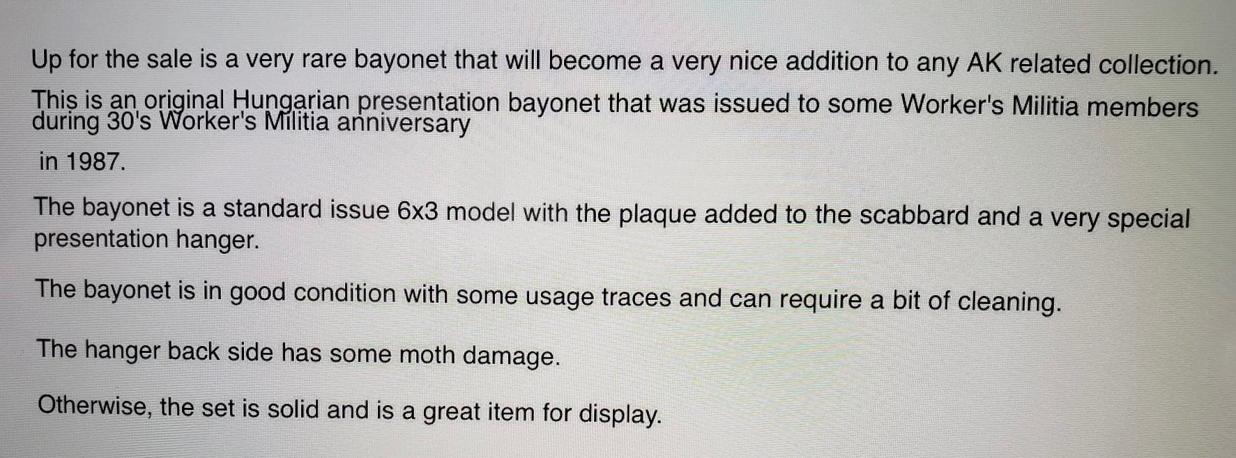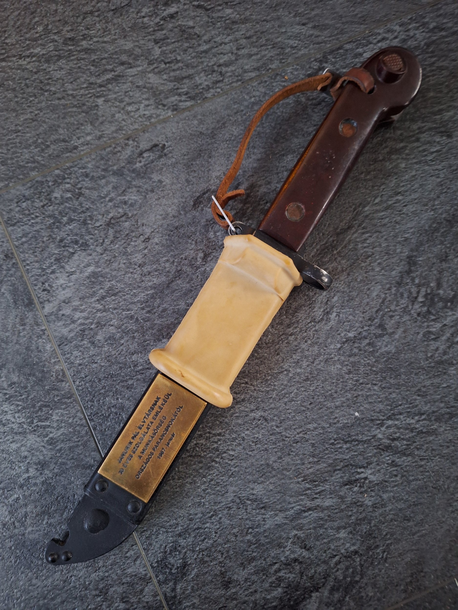 At least i am glad to hear that it is a authentic piece from the people's republic of Hungary. I'm still very happy with it and it sits as a nice display piece in my collection. I am very curious about your information source(s) for these type of bayonets.