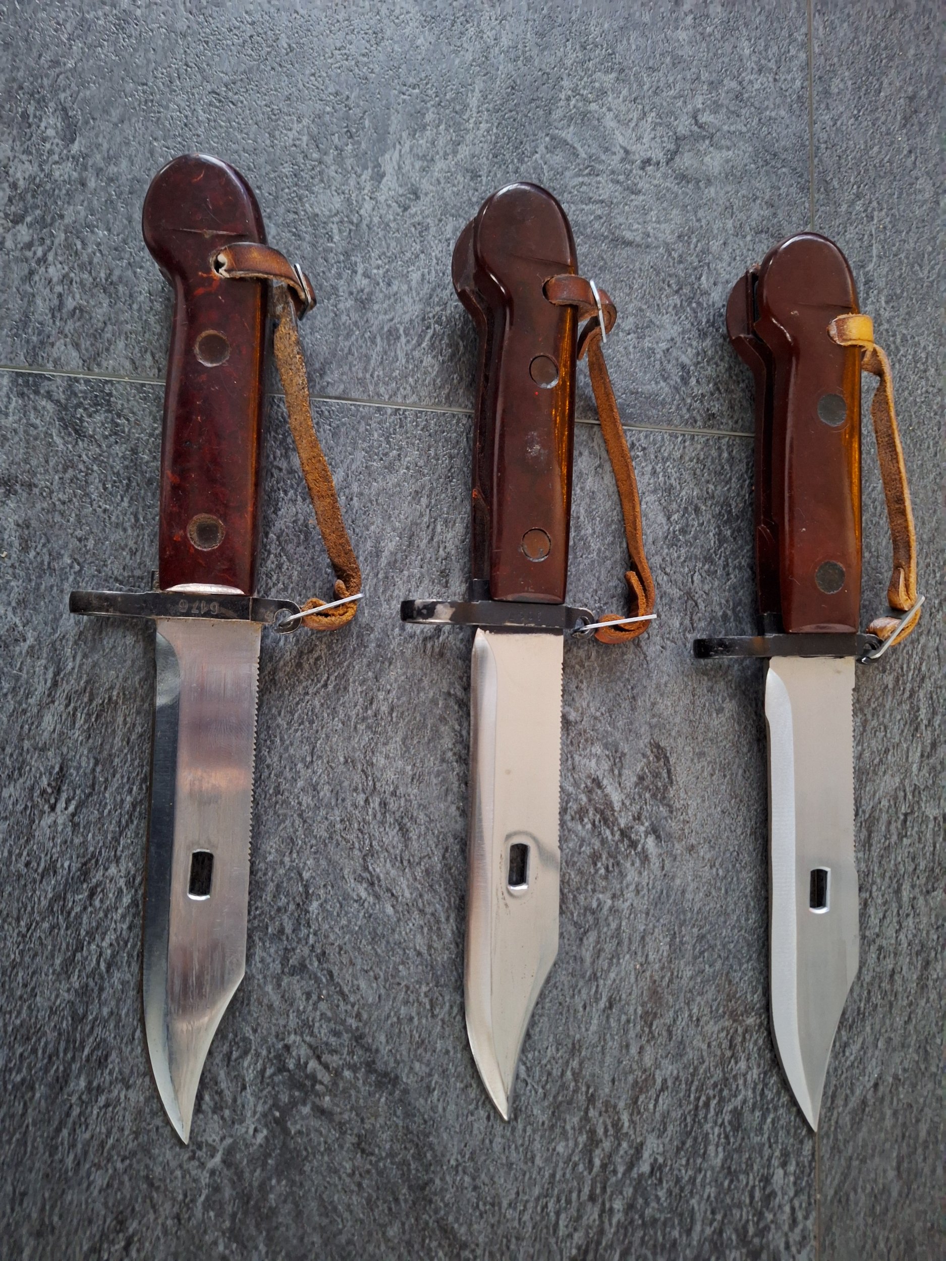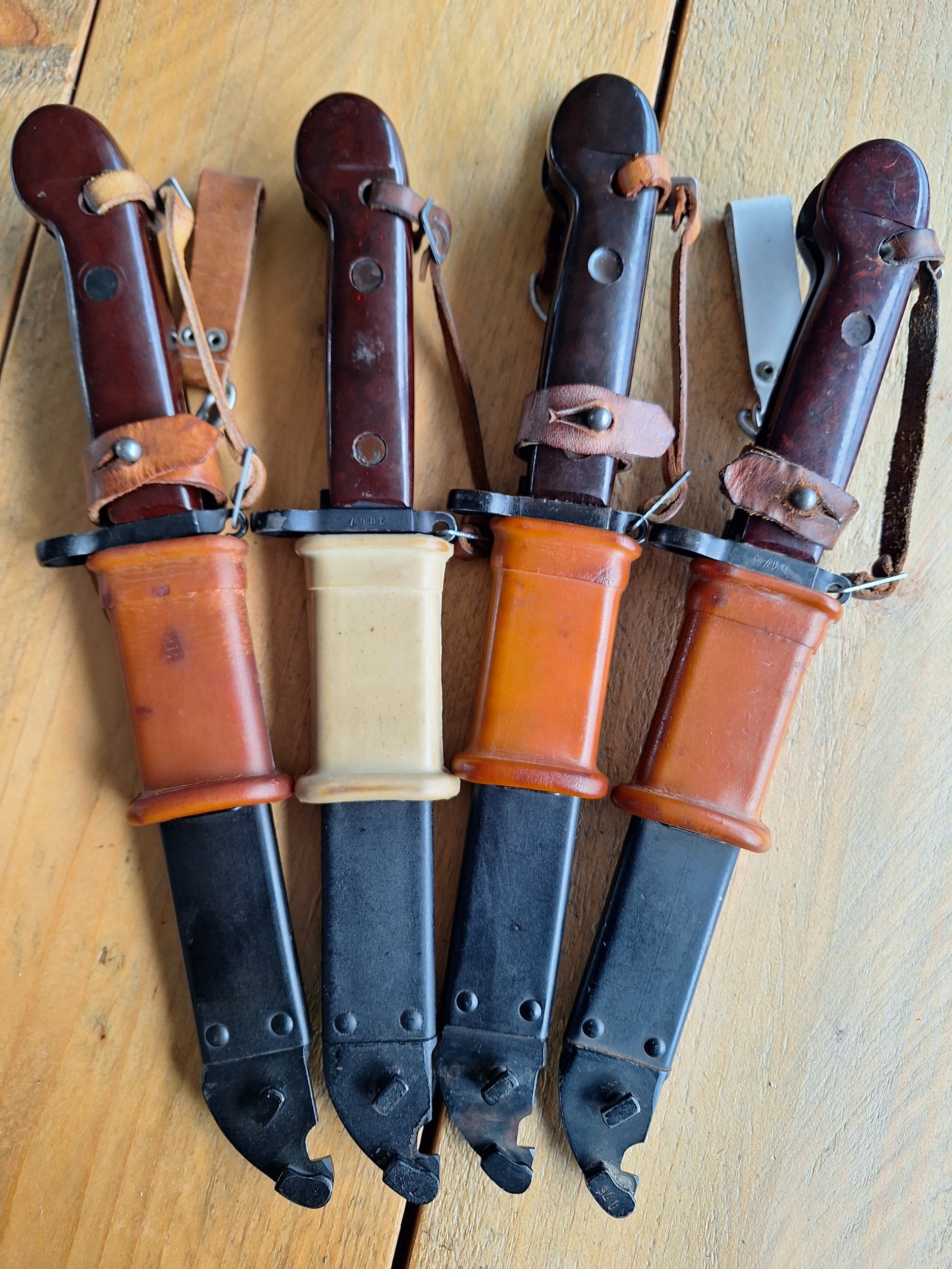 Some were cleaned up, dressed up bayonets and scabbards from the scrap bin. Out of tolerance or slight blemishes, basically quality control rejects. Some have chromed metal part, Some without sawteeth, irregular sawteeth, damaged blades, etc..