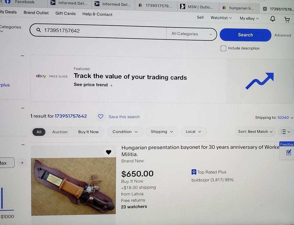 The eBay number works for me. Maybe due to the location? Here are the pictures and info from the listing. Too much of a coincidence not to share!? Compare with yours. Unfortunately nothing special about the bayonets or scabbards. Each just picked from a pile of rework and put together randomly. Both of the pieces put together for the January awards. Mike