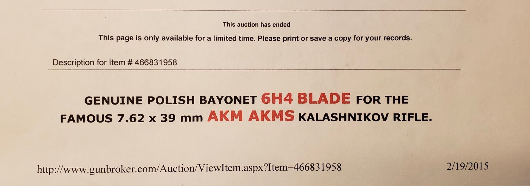 Recently a picture was posted on another bayonet collectors site. It showed what appeared to be a late version Polish AKM 6H4 Type II hilt whith a black grip, (Beryl?). It also had a what appeared to be an even newer Polish Grote bayonet blade. The Grote is not a Kalishnikov bayonet. There were lots of questions and concernes about it being real or a fantasy item. At the time I remembered this advertisement featuring new/mint Polish 6H4 blades for sale on 2-19-2015. They were “buy now” for $25.00 plus $10.00 postage internationally from Warsaw, Poland. I just found the add. It appears possible incomplete hilts may have also been available!? Mike