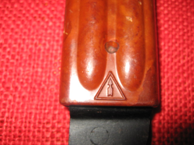 Before addressing the marking on the bayonets, it should be noted that the arsenal markings on the 6X4 scabbards from both arsenals are present on all of the scabbards. The molded in Tula star and Izhevsk arrow in triangle are located on the lower edge of the back side of the scabbard just above the cutter plate. These marking can be found with a multitude of different variations, large, small, rounded corners, slightly different shapes, etc.. Probably from different times and molds, and to numerous to address. It has also been noted that there are also one or more different markings, supposedly from another manufacture, possible as replacement/rework.