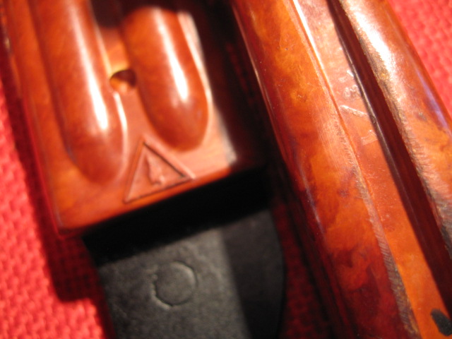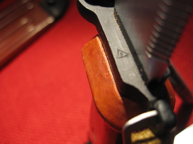 I found this picture of a slightly different version of the Izhevsk triangle and arrow on the right side of the grip. right side up with rounded corners. Mike