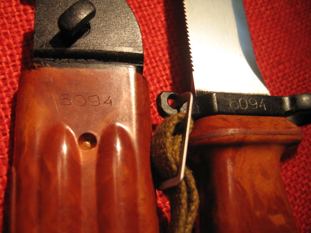 These are pictures from my collection of an original matching 6X4 Tula bayonet with second step arsenal markings. Note the mold numbers on the grip side and the exposed rivets on the cross guard.