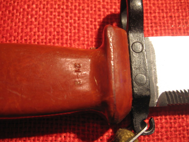 Now for the next, or second step in Izhevsk and Tula arsenal marks on Russian 6X4 bayonet. The arsenal marks are now found stamped on the front of the cross guard next to the blade. During this phase several other changes also seem to take place. Mold numbers begin to appear on the plastic grips in various styles and positions. Also the change over from the old tapered pins securing the cross guards, (smooth finish), to the countersunk exposed rivets takes place at both arsenals. Pictures to follow.