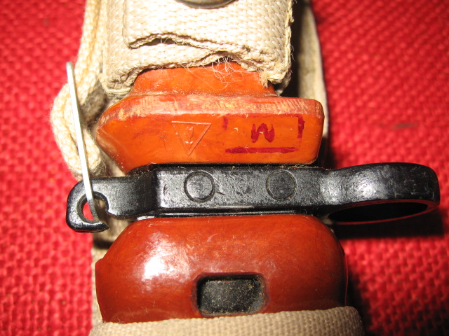 Now for the forth and final step in Russian 6X4 arsenal markings. As stated previously, it seems that Tula ceased production of bayonets and scabbards sometime during the third step. The Izhevsk arsenal moved the molded arrow in triangle mark to the grip bevel next to the cross guard on the right side of the grip. There is a multitude of difference in placement and shape of these marks and mold numbers. This step seems to be the most current and most common of the Russian 6x4 series. These forth step bayonets all appeared to be issued with a narrow khaki wrist strap and brown pebbled leather hangers with round wire "D" rings.