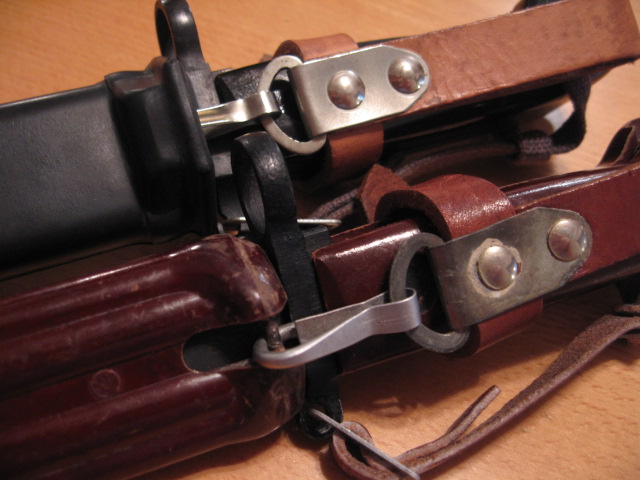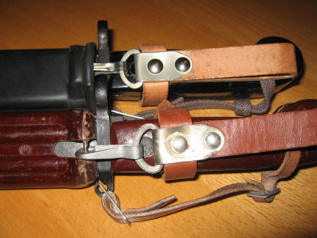 It could indeed be East German, very similar at first sight. But I still think it most closely resembles the Russian style hangers. Here are some close ups and comparison to an early East German AKM 6X3 Type I with a tan hanger from my collection. The points of difference are most obviously the snap hook and the finish on the metal parts. The hanger on the Iraqi scabbard has corrosion on the metal parts. On the DDR hanger the metal parts are a higher quality of metal and finish. The DDR rivets are slightly larger and more domed. The DDR hangers are usually a smooth natural tan whereas this one is darker brown textured color and is a much thicker leather. Mike