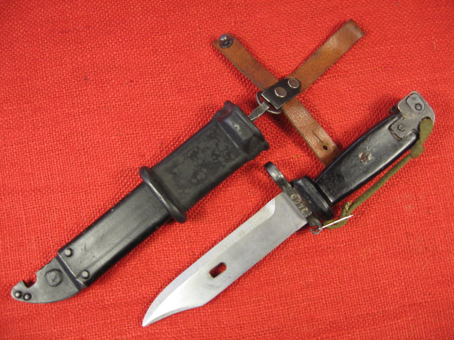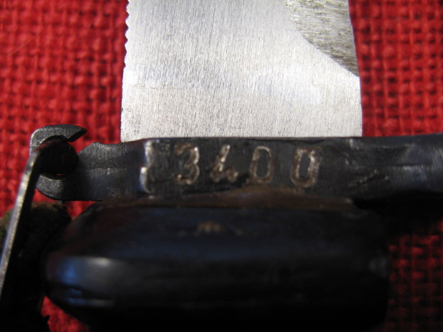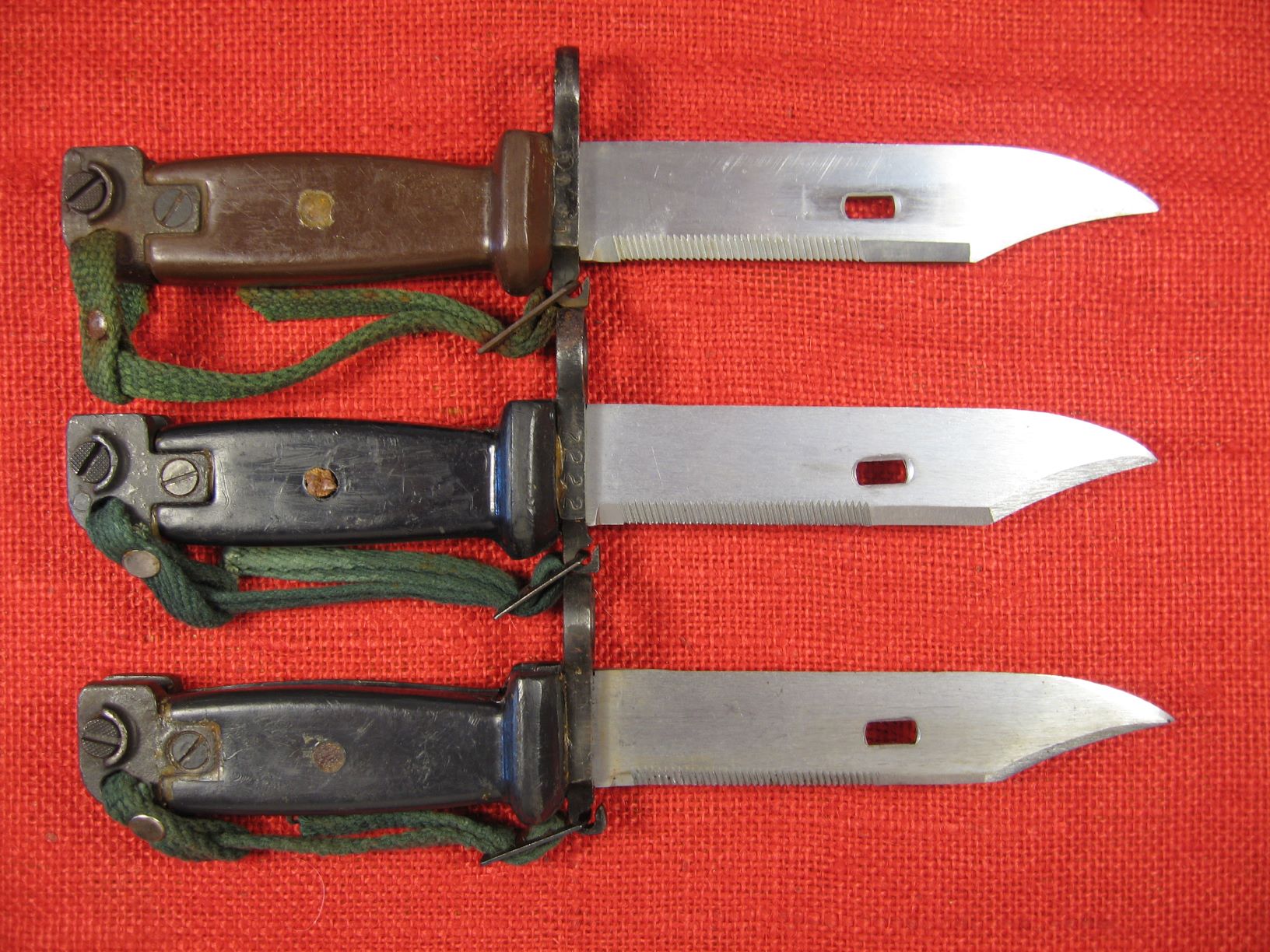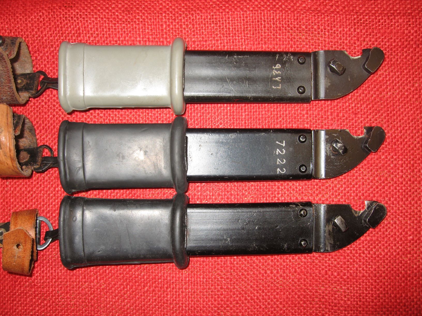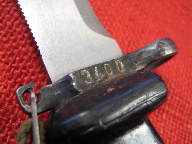 For the most part the Egyptian AKM 6X4 Type II bayonets with Type I scabbards are unmarked in any way. No arsenal, proof, QC or numbering marks. The exceptions to this is that some can be found with matching Arabic numbers on bayonet and scabbard, (brown grips only?). Also a few can be found stamped block English numbers, (Dk Blue grips only?). The brown grip bayonet came from Kuwait after the 1st Gulf War and was supposedly early Egyptian issue. The one with the English numbers is thought to be one exported from Egypt for a special contract. Or possibly numbered in one of the Balkan countries for their use. Pictured below are the numbered ones and a standard un-marked one for comparison.