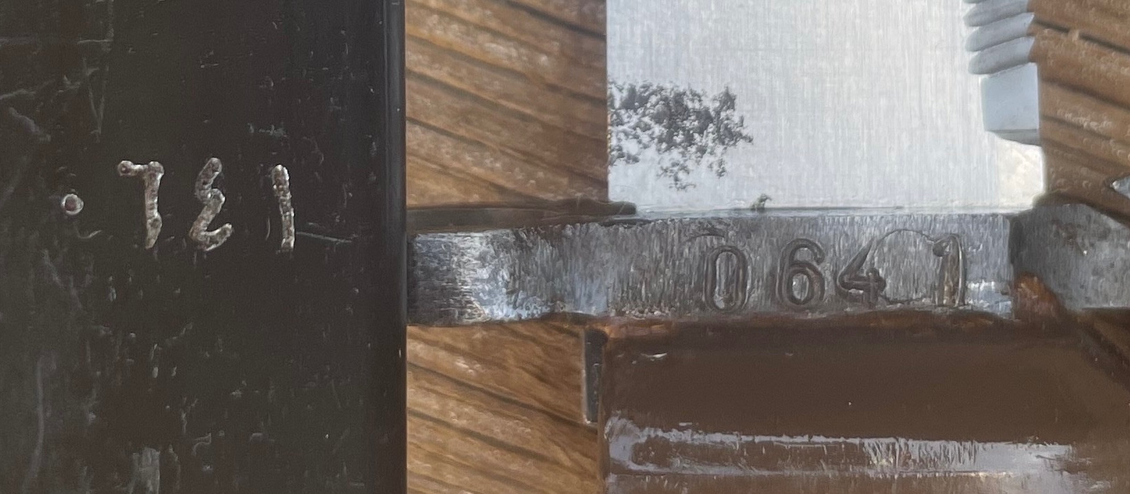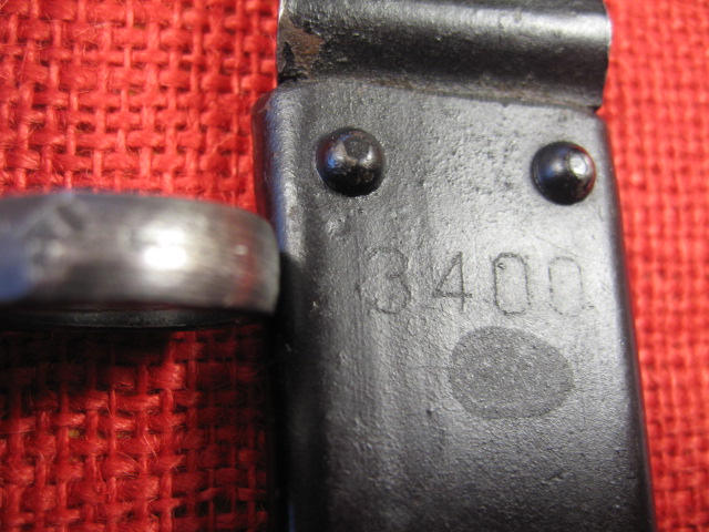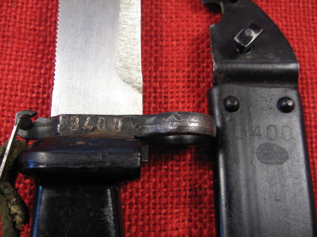 This is a unique picture of Egyptian AKM 6X4 Type II bayonet and scabbard markings. A collector recently posted this picture on another site. The scabbard has hand etched Eastern Arabic numbers. The bayonet has die stamped Western Arabic, (English), numbers on the cross guard. When translated they are both the same. Matching numbers! Mike