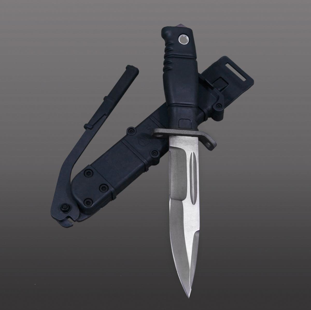 I really like this bayonet with its new features. Glass breaking triangle protuding beneath the pommel and the scabbard with build in wire cutter.