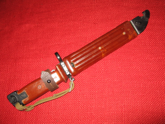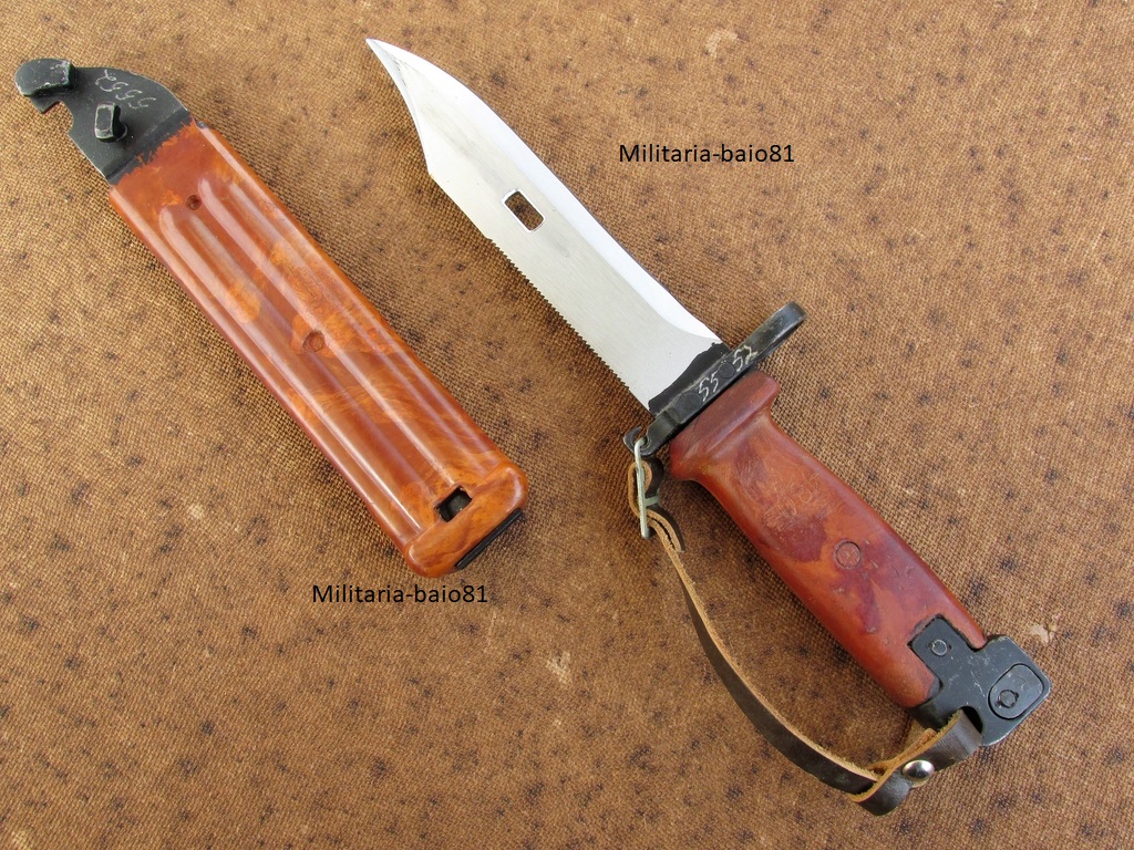 A: I asked my guys and they told me that the bayonets and scabbard in black color is made only for the army of East Germany. There was a brief period of time (1990 - 1991) when the black bayonets & scabbard made in the Izhevsk plant. For the Soviet army always have red bayonets and scabbards. In the photo, I didn't see the markings you're asking about. It is possible to make a detailed photo? Green bayonets and scabbards indeed have made for Soviet border guards as gift option.