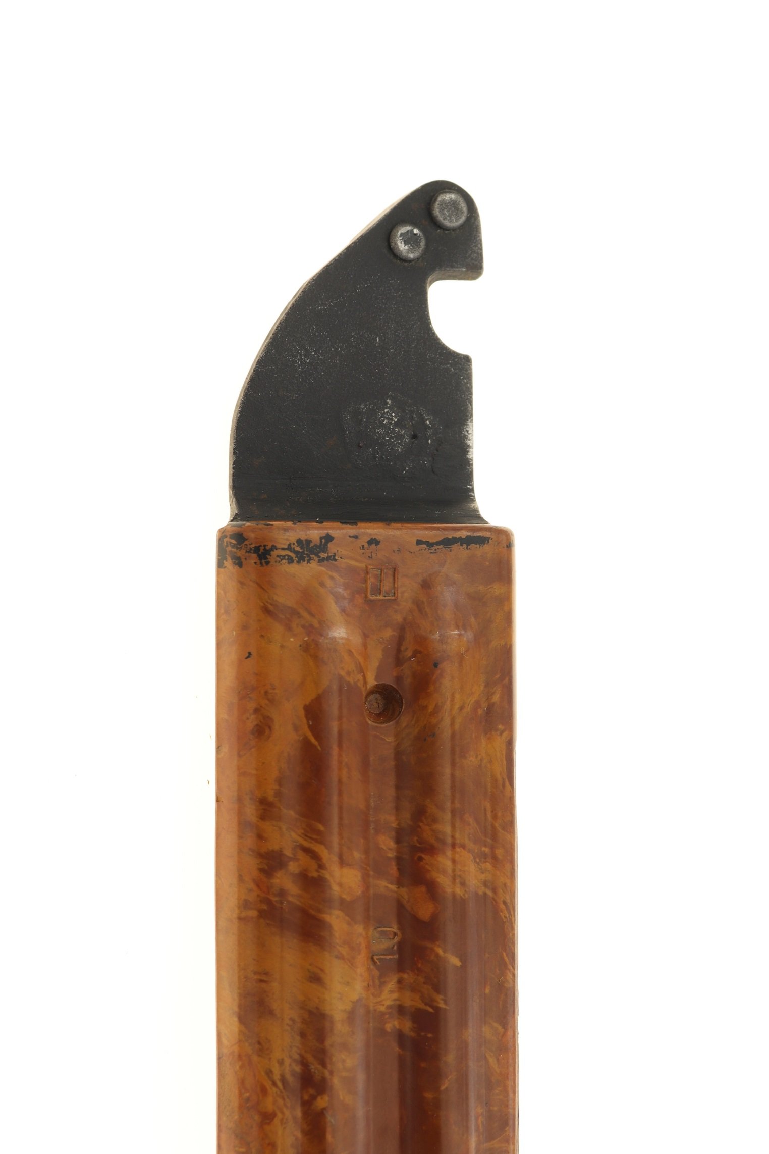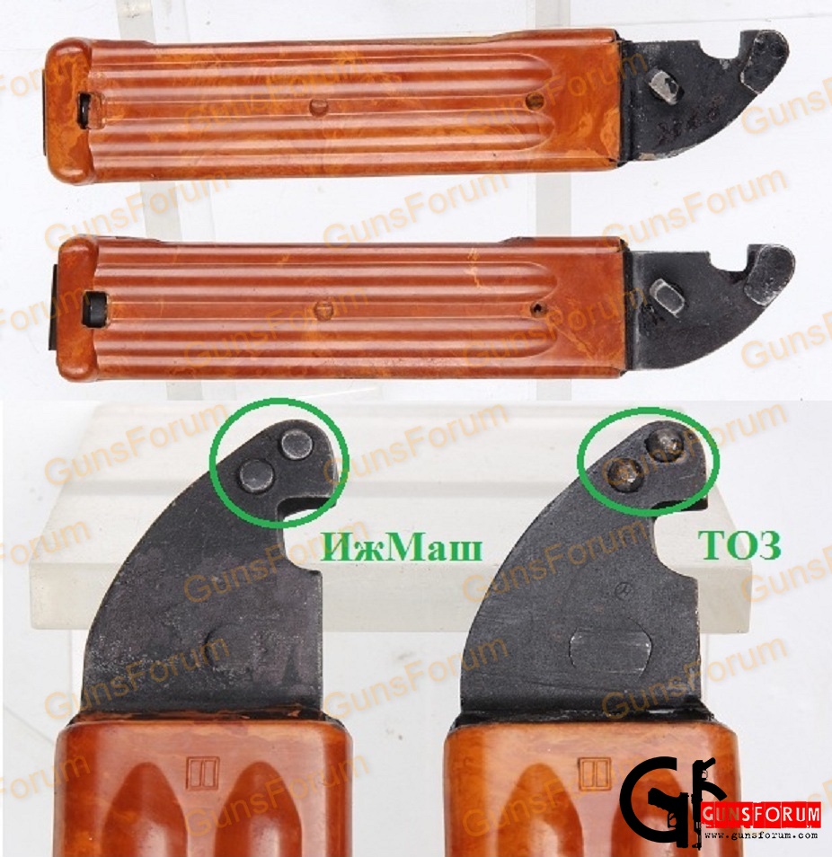 What I take away from this regarding the "split-box" marking is these scabbards were the first design of the type. They were evaluated in-house and likely refined. One would think some small number might have been made for actual field trials, but this is not a certainty. Seems logical grips were made as well wit this same marking as well. The final pattern, exact formula for the polyamide composition, and maybe even dies were then farmed out to Izhevsk & Tula for general production.