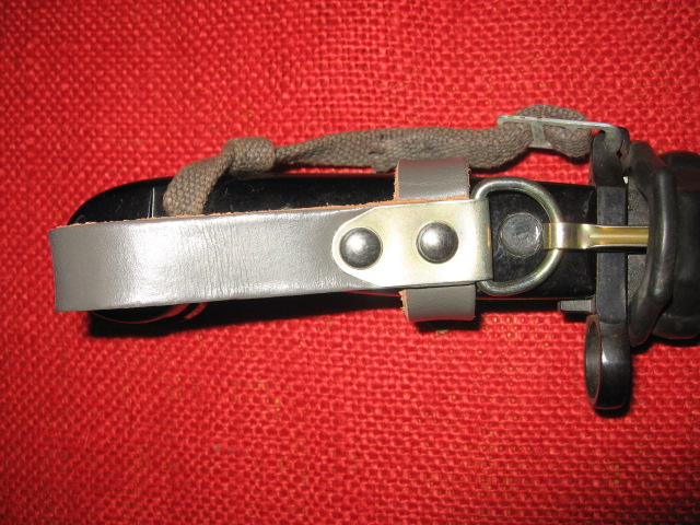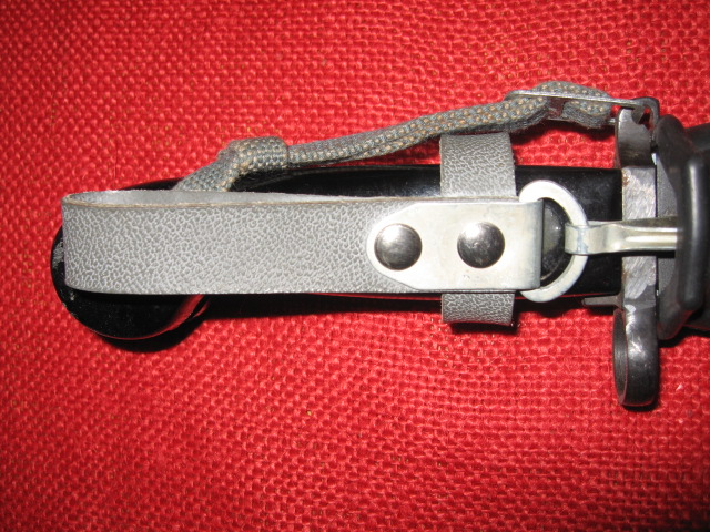 It appears that with the introduction of the AKM Type II bayonets a new hanger was designed. It is the same as the previous Type I hanger, but the grey leather belt loop has been lengthened. This change over may not have happened at the same time as the introduction of the Type two and the different hangers cane be found on both. Remember the hanger and strap are easily switched around and do not necessarily identify or age a bayonet and/or scabbard.
