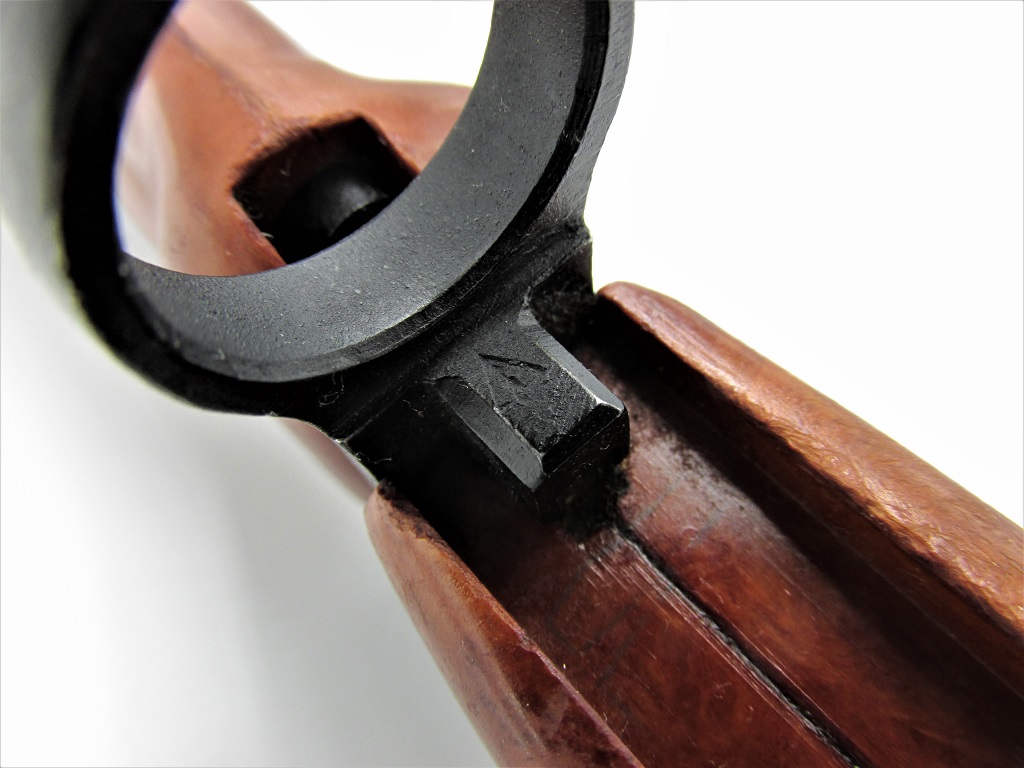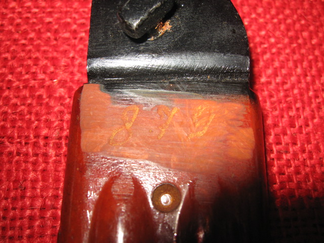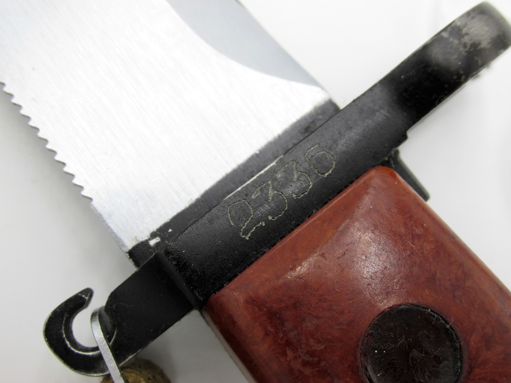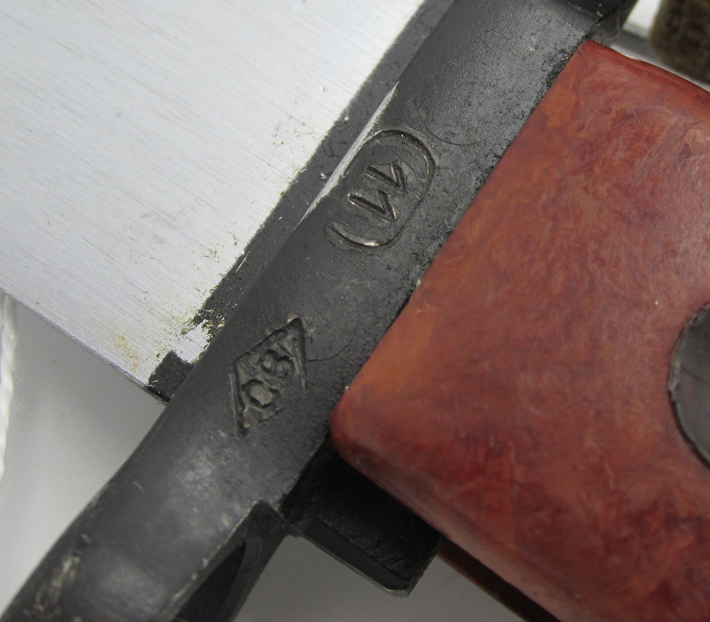 I have two Izzy examples, but both are the result of refurbishment. This is evident by the sloppy, glued screw plugs on the grips of each (and the first one having a etched serial number on the left side of the grip, just forward of the front plug). This bayonet had a original scabbard number shaved off, but interestingly it is a "mold #6". The other bayonet has a etched serial number on the crossguard which matches the unaltered number on the scabbard. However, since the scabbard is "mold #285", this would be a much later refurbishment, with the bayonet matched to either an unaltered scabbard number, or new scabbard numbered to match the bayonet.