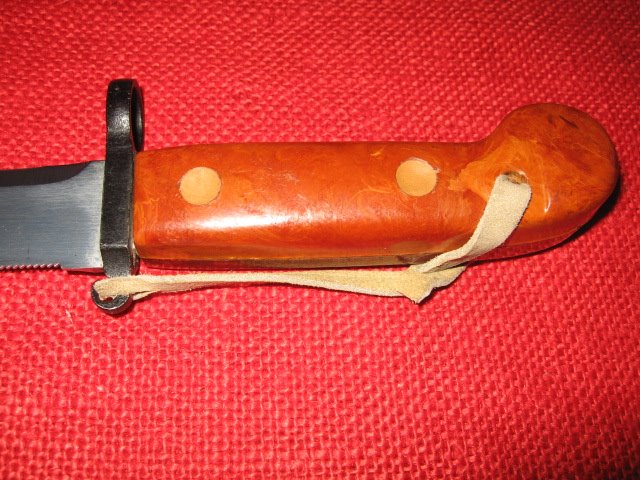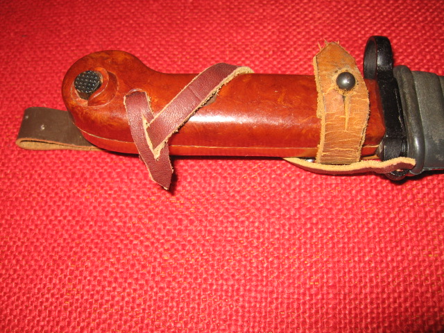 Ever since the Russians introduced the AKM 6X3 Type I bayonet and scabbard there has been a lot of speculation about the hole in the pommel and the hook on the crossguard. Was it to attach, hook or tie, a lanyard of some kind? Was it really designed for attachment of a short strap and why? The earliest illustrations I've found in Russian AKM manuals show a very rudimentary leather that looks like an after thought. The most common theory is that is was added to provide a more secure grip under adverse conditions. The smooth synthetic grip panels could be slick when wet or cold. The first strap appears to have been a simple leather strap with slots on both ends to form a loop at the pommel and hook on the crossguard hook. Below are a copy of a bayonet illustrated in an early AKM manual. The next pictures is of a replica I made from an original one. It was on an early 6X3 type I, but it was stiff, dried up and disintegrating. Since then I have found several other partial and damaged ones in shipping containers of reworked bayonets from Russia and Bulgaria. I have also had a Romanian 6X3 with a complete but hardened similar strap in place. Mike