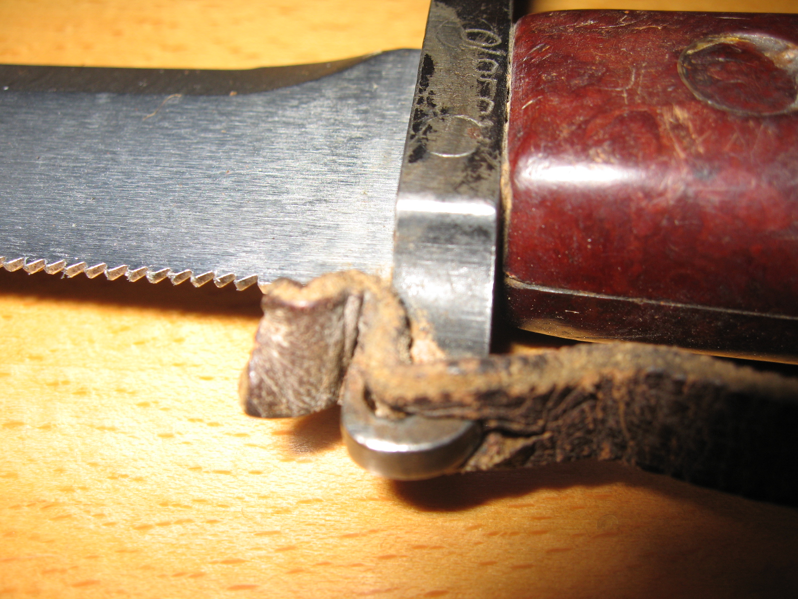 The next step in hilt strap evolution replaces the leather strap with one made of woven cotton canvas material. This fabric was much more durable and longer lasting the previous leather ones. The canvas straps vary in weave, width and color. They are various shades of khaki and the colors also change with usage and exposure to the elements. Some people believe the change to canvas was made with the introduction of the AKM 6X4 Type II bayonets. I question this in that I have two original late issue Izhevsk 6x3 bayonets that came with the canvas straps. On the other hand I also have an original early issue Tula 6X4 bayonet that came with a tan leather strap. Regardless to when the change was made most of the 6X4 bayonets seem to have come with canvas straps. Many of the 6X3 bayonets found with canvas straps are a result of being replaced during inspection and rework. Most of the Russian strap and hanger rivets have washers, (usually black), on the back side. Some are without washers, but have glue/sealer around the rivet hole. similar to the sealant on the ends. Mike