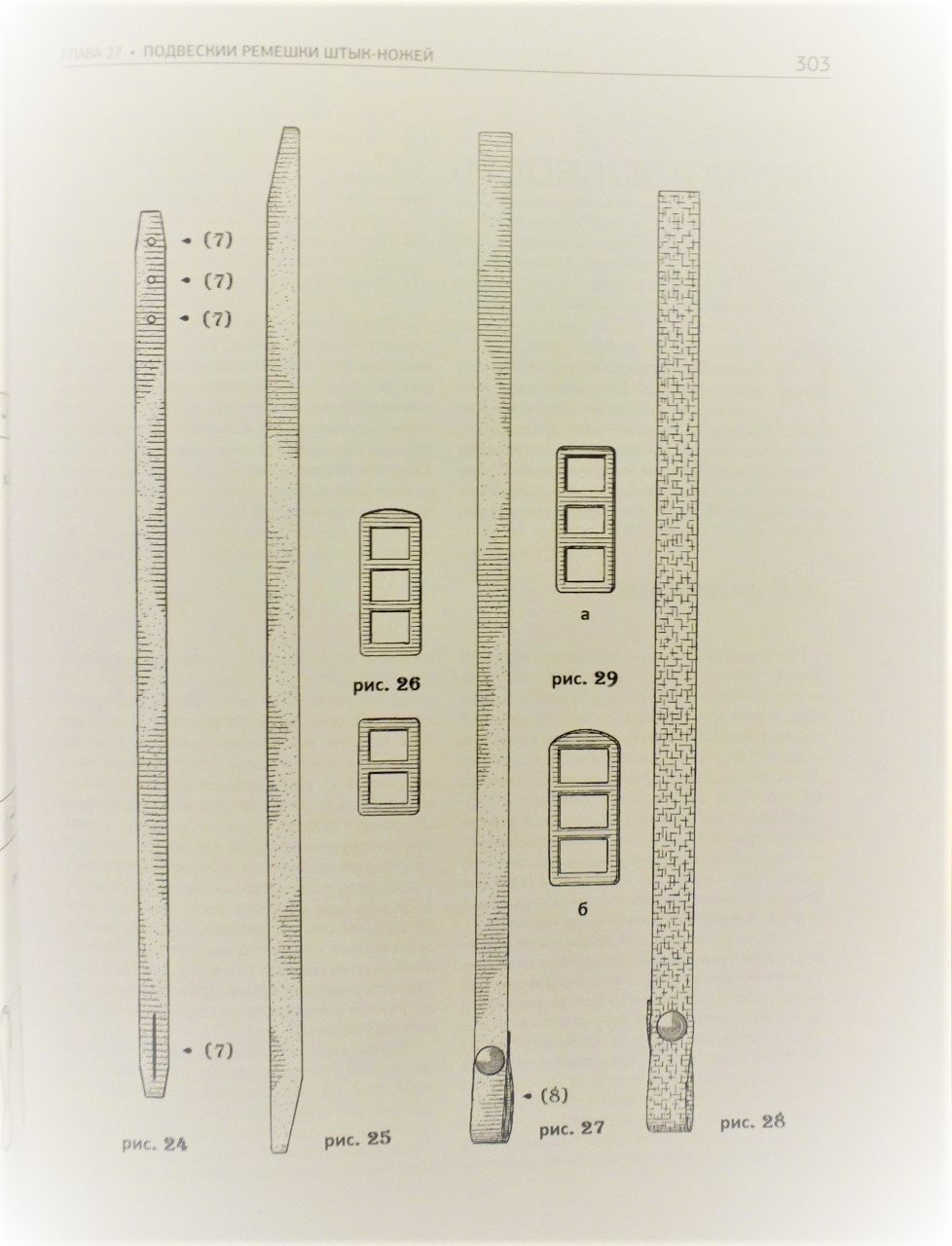 Here's another version of the original all leather, no buckle, hilt strap. This one was found along with other scrap parts and pieces in a container of reworked Russian AKM 6X3 Type I bayonets and scabbards, Also a scan from a Russian book with line drawings of the variaty of the hilt straps. From left to right; the original all leather, leather with two buckles, leather with rivet and one buckle, Fabric with rivet and one buckle. Mike