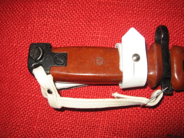 I need to make a correction on the post about the AKM 6X4 Type II bayonet and scabbard with the black canvas hilt strap. There is also o a WHITE version of the hilt strap and hanger for parade or dress use. Mike