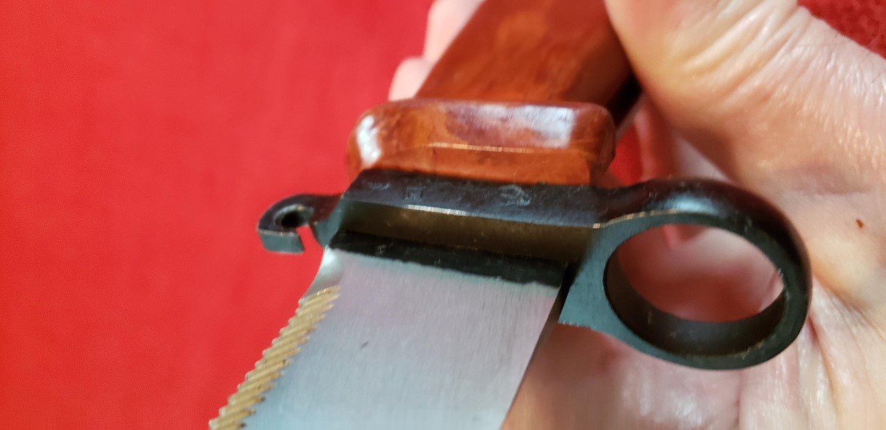 Has anyone else noticed the difference in the molding of Russian AKM 6X4 Type I bayonets from the Tula Arsenal? The Type I bayonets are the ones with the machined cross guards with flush ground rivets. I have both the early style with the arsenal mark on the flat behind the muzzle ring and the late style with the only arsenal mark stamped on the front of the cross guard by the blade. Both of these have molded grips with a flat front where they meet the cross guard. Both of the grips are smooth with out any mold marks. The grips on all the other AKM 6X4 bayonets in my collection from both arsenals taper to meet the cross guard.