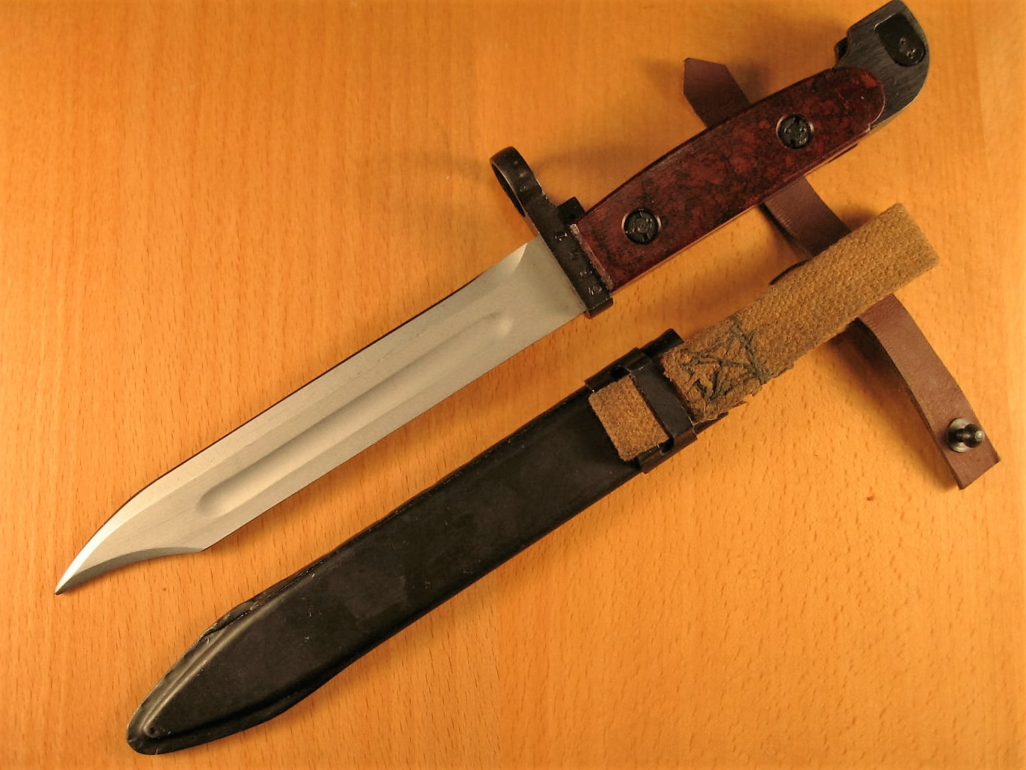 This a second version of the North Korean AKM bayonet. It is virtually the same as the first version with the exception that the Fabric hanger is tan colored. The tan versions have been found in Granada, Panama and Cuba among other places. There is some discussion as to whether they were made in N. Korea for export or just a production variation. Others believe that the were made or assembled in Cuba and or other countries on N. Korean equipment. M.