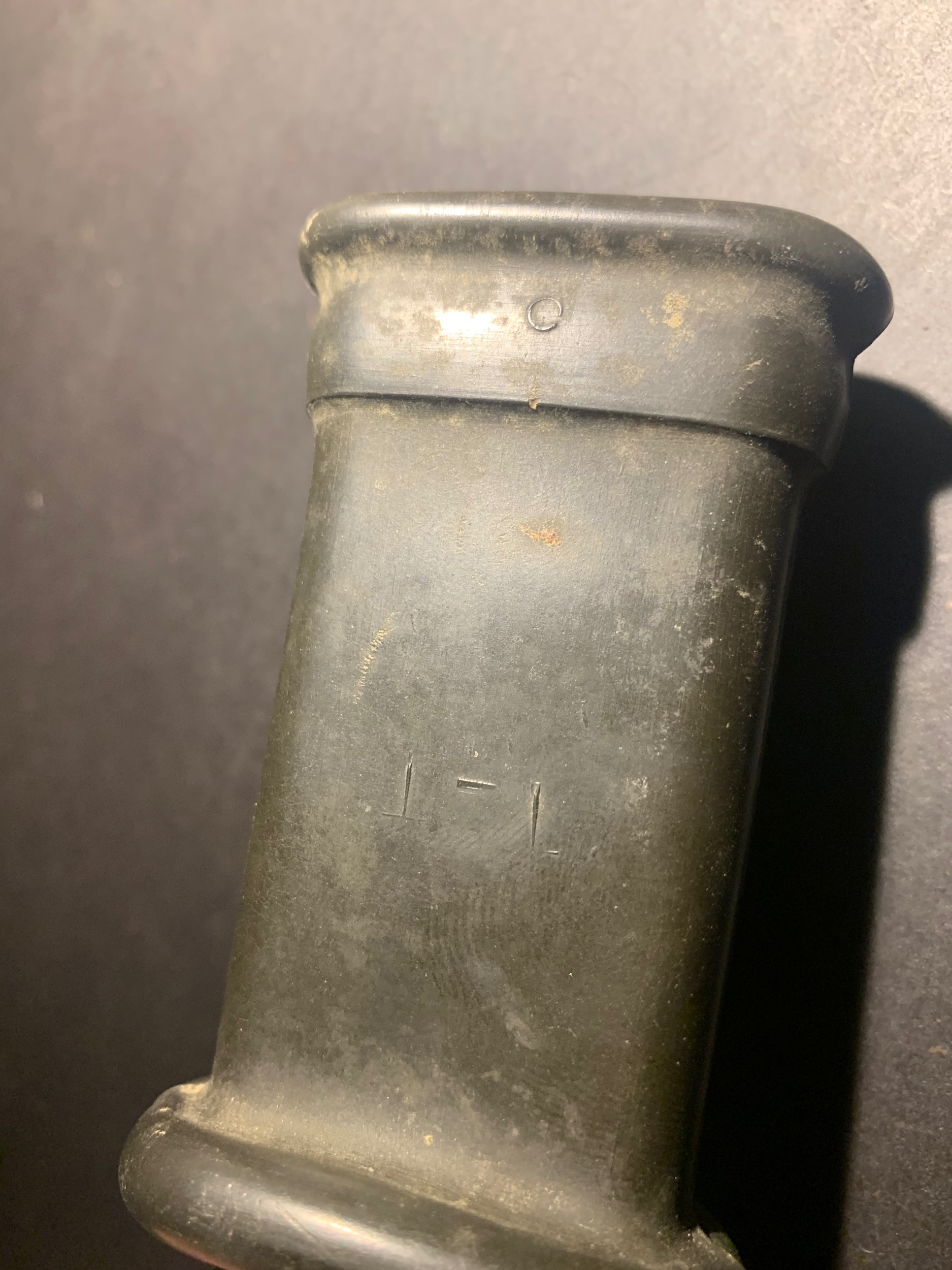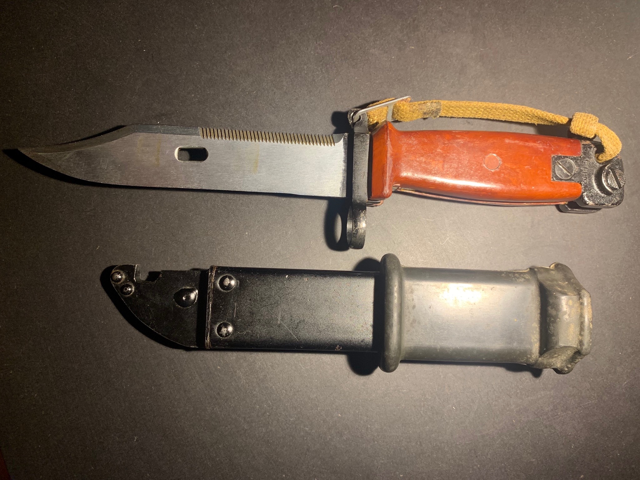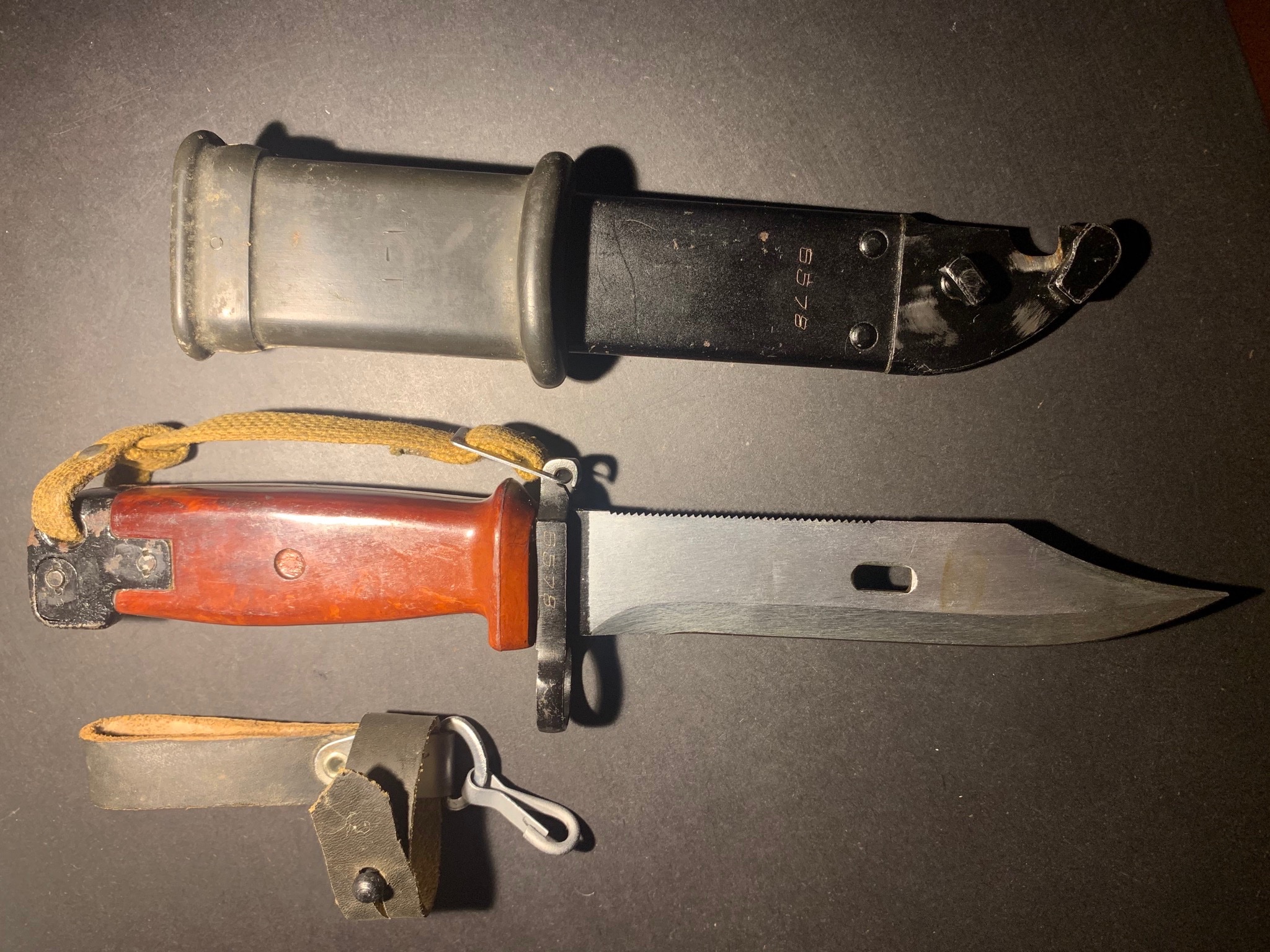The bayonet is definitely a very early Tula AKM 6X4 Type II with the carried over arsenal mark on the flat behind the muzzle ring. Very interesting markings on the pommel not found on later production. The scabbard is definitely a late version Tula AKM Type I. All the markings and numbers appear correct for this time period as well. The only things I would question would be the insulator and hanger. I would have thought that the insulator with the "T-T" markings was from very early Tula production. Those early markings are rare and were eliminated with simplified later unmarked mass production. To me, the hanger appears to be a more of a universal style usually found as a replacement or reconditioning item on both Tula and Izhevsk bayonets and scabbards. The original Tula hangers in this transitional time period would have been the light tan ones with a flat "D" ring. Just my humble opinion. Mike