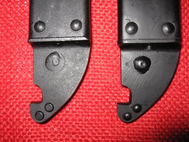 You can identify the scabbards according to arsenals by the rivet heads on the back side of the cutter plate stop. The Izhevsk ones have flattened heads. The Tula rivets have rounded heads. This is true for both the Type I and Type II scabbards. The drawings are from a recent Russian reference book. Mike