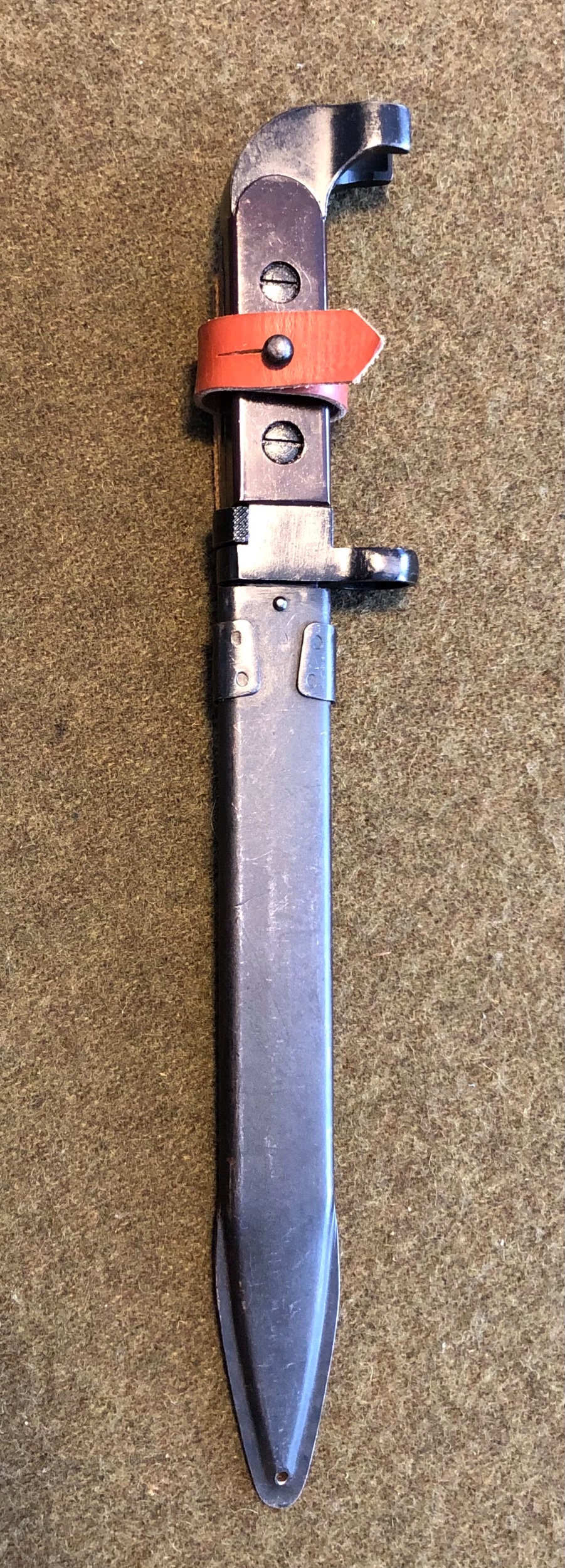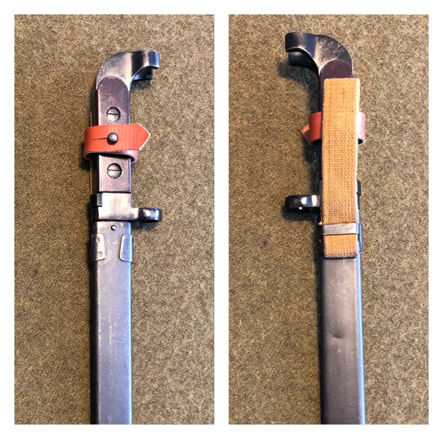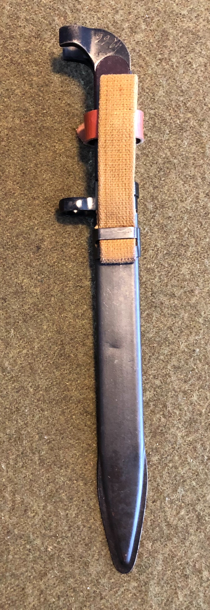 1. First of all, the scabbard is not a definite way to identify this style of bayonet as they are not numbered or tied together in any way, This scabbard is a late issue variation. it has the Russian drain hole in the front and a one piece stamped hanger bracket. Also, the fabric hanger appears to have the late style synthetic, (vinyl), hilt strap.
