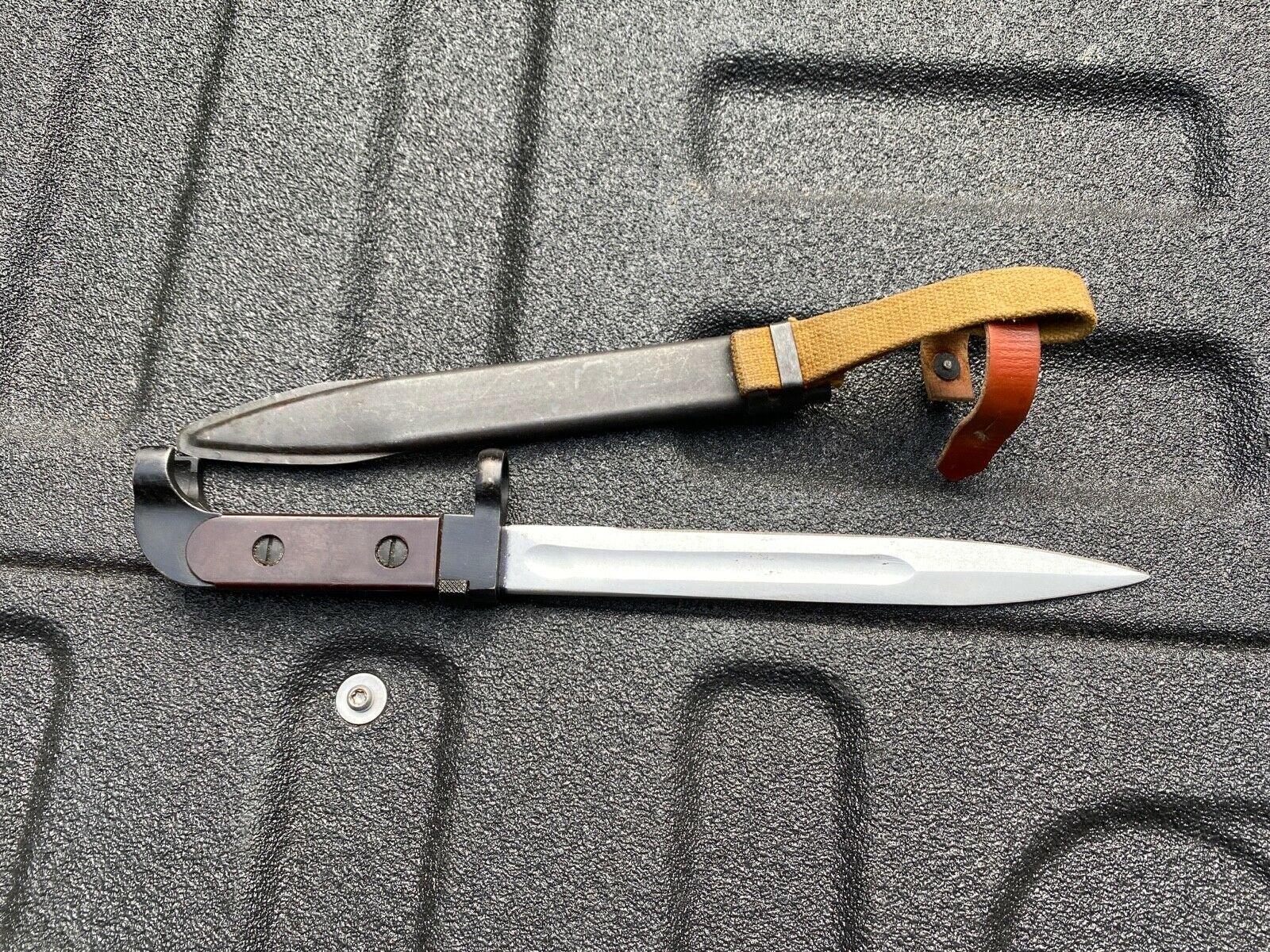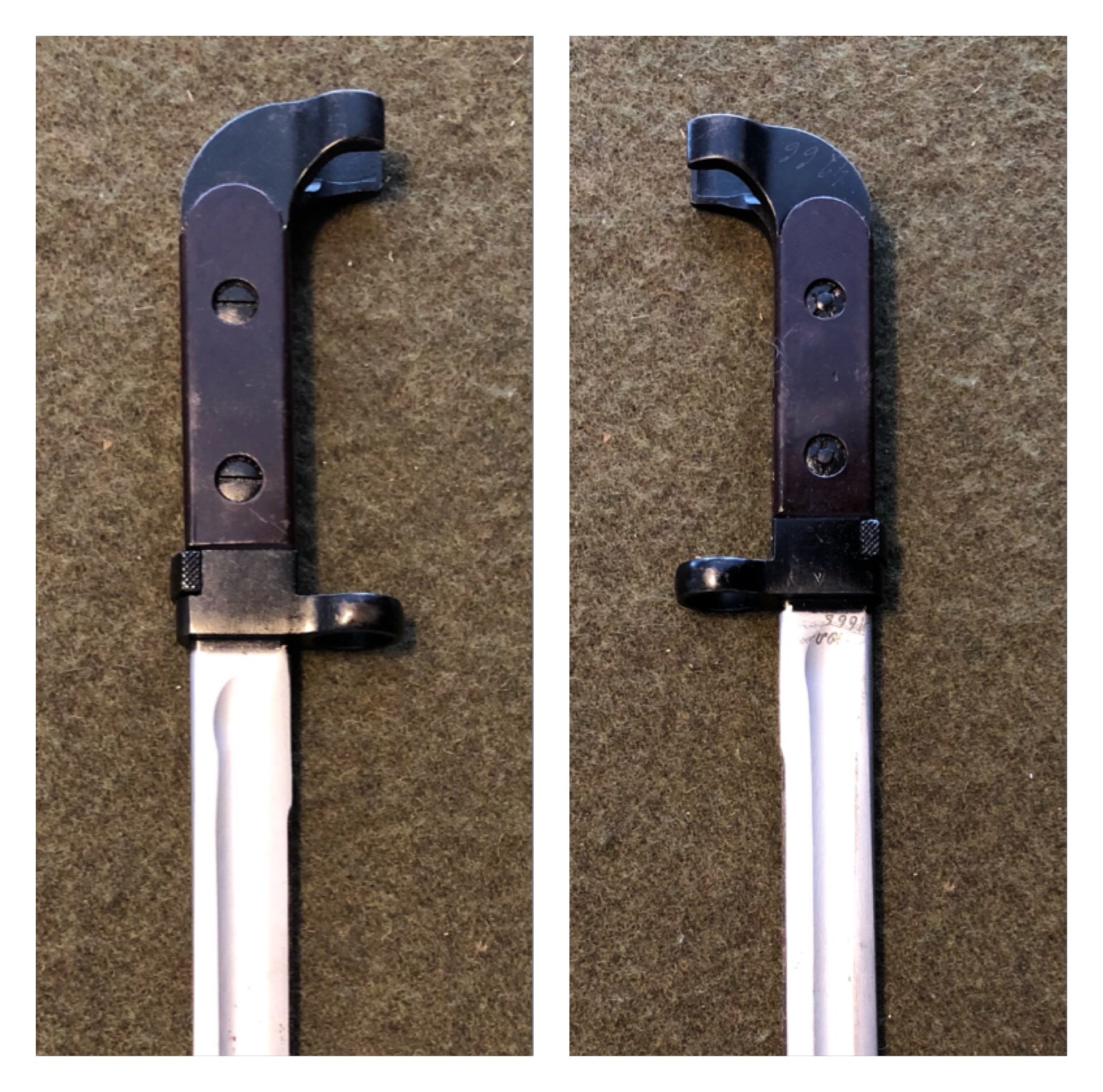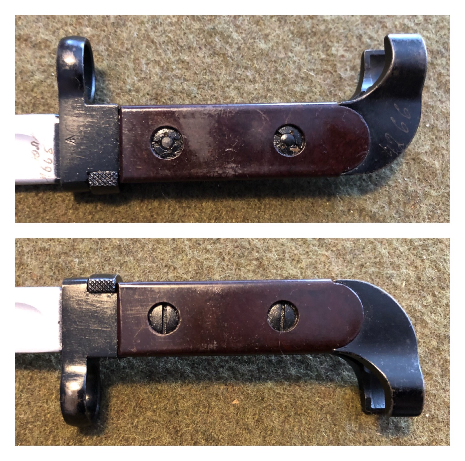 1. First of all, the scabbard is not a definite way to identify this style of bayonet as they are not numbered or tied together in any way, This scabbard is a late issue variation. it has the Russian drain hole in the front and a one piece stamped hanger bracket. Also, the fabric hanger appears to have the late style synthetic, (vinyl), hilt strap.