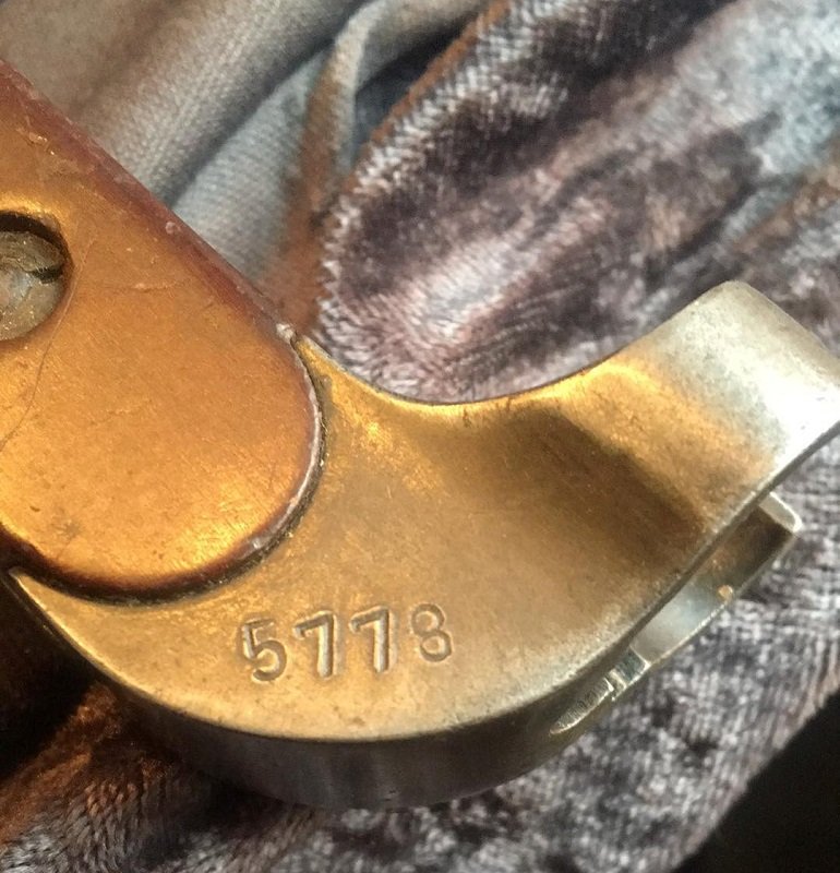 Let’s start with the scabbard. It is the early style with the two band hanger brackets. It has no visible drain hole at the tip. The Finnish scabbards do not have holes. Some early Russian scabbards did not have drain holes, but most were added during ongoing inspection, repair and rework over the years. The Finnish 1st contract (early) scabbards had two tone sanded body that was then blued. The appearance was similar to the Bulgarian scabbards. The Russian scabbards had no sanding and were painted black. Both the early Finnish and Russian scabbards had a tan/khaki woven fabric belt loop. They also both had a leather hilt loop. All the Finnish ones had the loops connected bay sewing. Some Russians were also sewn, but most were connected with a single rivet. The Finnish ones used a green thread and had a different sew pattern than the Russian ones. REGARDLESS of sewn or riveted, the hilt strap CROSSES THE WRONG WAY, to be Finnish or Russian. They cross from left to right >>>. The one in the pictures crosses right to left <<<<<, Bulgarian style? Not sure what’s it is, possibly repairs or replace at some point?